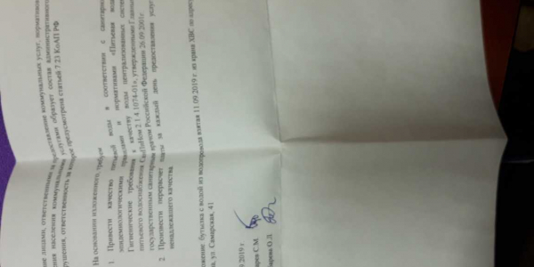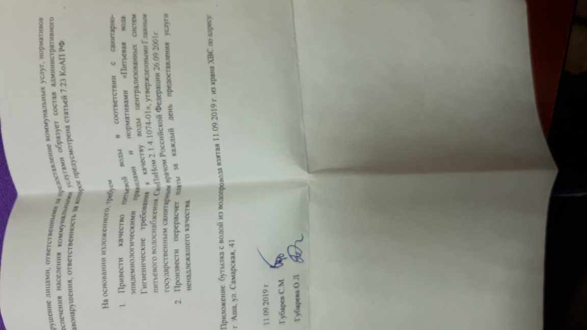 Номер жалобы:60558 Тип жалобы:Иные проблемы ЖКХ Название объекта: Регион:Челябинская область Город:Аша Адрес:Аша, Самарская улица, 41 Описание жалобы:Ненадлежащее качество питьевой воды Статус: