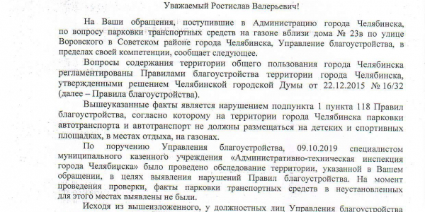 Номер жалобы:60568 Тип жалобы:Иные проблемы ЖКХ Название объекта: Регион:обл. Челябинская Город:Челябинск Адрес:улица Воровского, 23В Описание жалобы:ПДД Парковка на газоне Статус: