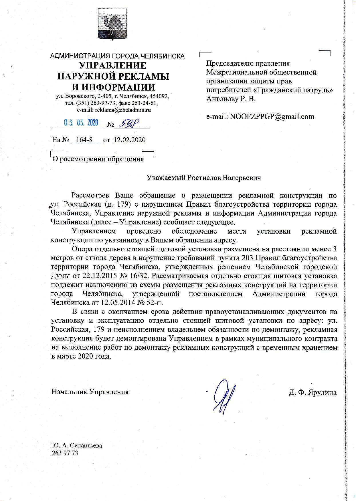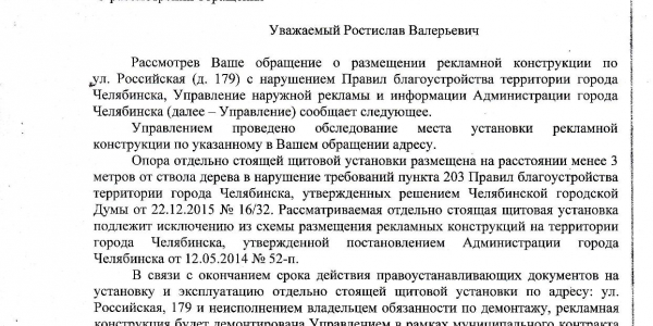 Номер жалобы:63621 Тип жалобы:Прочее Название объекта: Регион:Челябинская область Город:Челябинск Адрес:Российская улица Описание жалобы:Размещение рекламной конструкции по адресу ул. Российская, 179 нарушает правила благоустройства г. Челябинска. Рекламный баннер находится ближе 3-х метров от дерева и должен быть демонтирован. Статус: