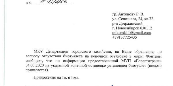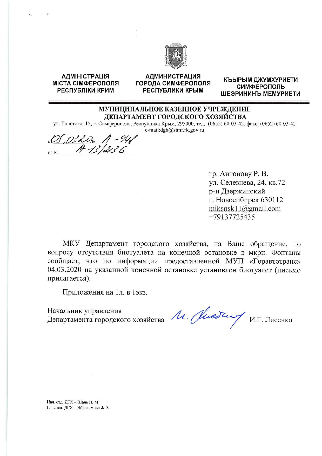 31.01.2020 в Симферополе с конечной остановки ул. Селим Герай / ул. Кара Дениз был эвакуирован био туалет, предназначенный для водителей маршрутных автобусов. Как объяснили сотрудники компании " Крымбио", - компания " Горавтотранс" не производит оплату за обслуживание туалета. Так же забрали туалеты с конечной остановки Акъ- Мечеть и Пневматика, на конечной 2 и 82 маршрута на ул. Луговой стоит туалет без герметичного поддона, выгребная яма выполнена на газоне в нарушение норм САНПИНА.