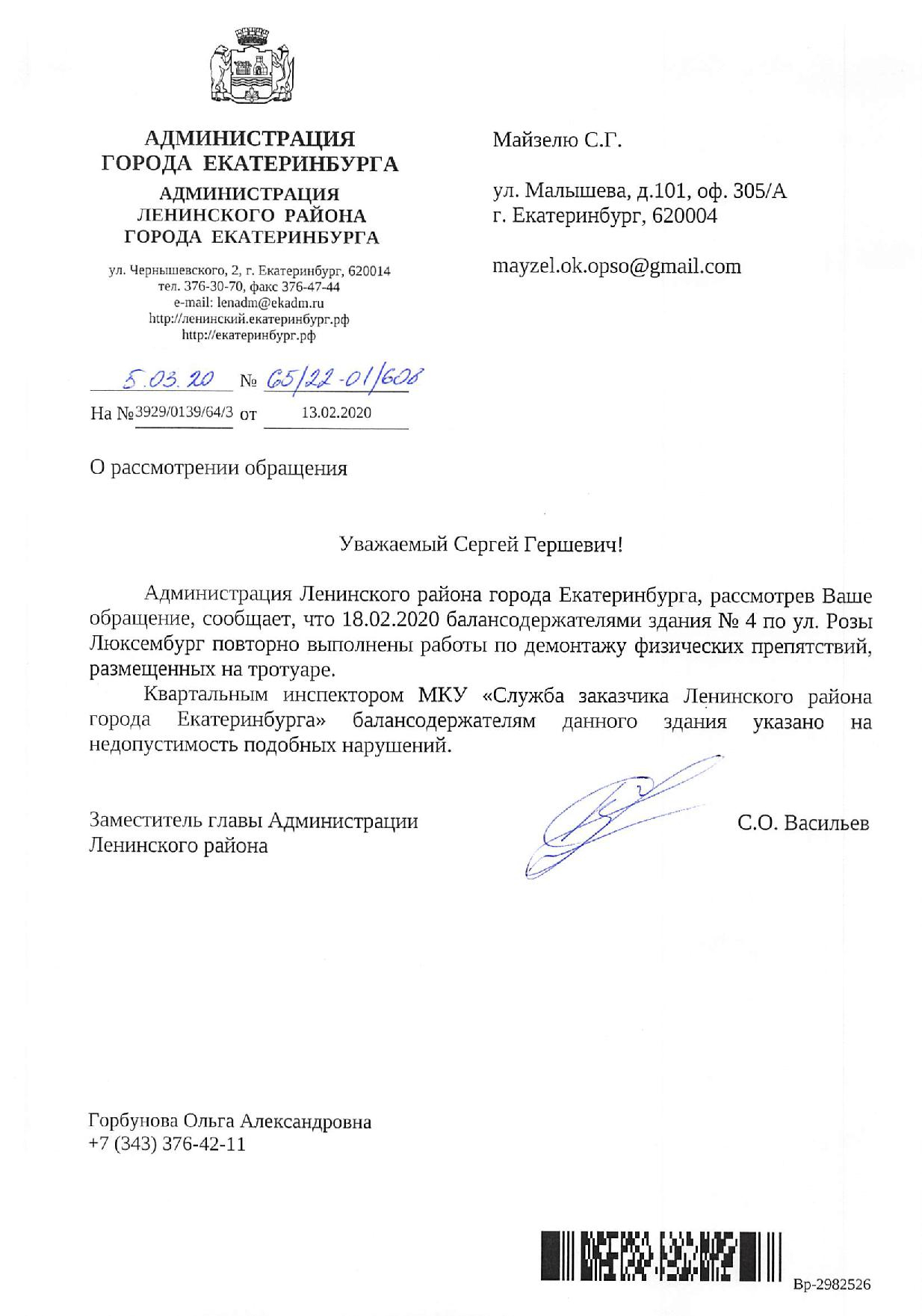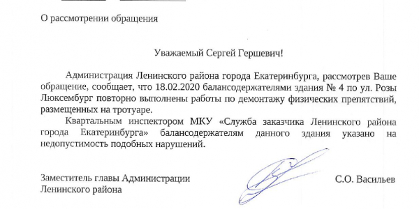 Номер жалобы:63710 Тип жалобы:Прочее Название объекта:мэрия Регион:Свердловская область Город:Екатеринбург Адрес:улица Розы Люксембург, 4 Описание жалобы:Проход по тротуару вдоль ул. Розы Люксембург на его пересечении со въездом во двор между домами 4 и 8/10 перегорожен секцией переносного ограждения и сигнальными конусами. По данной проблеме я обращался в жалобе 62242. На непродолжительное время ограждения перестали устанавливаться. Однако в настоящее время проход по тротуару вновь перегораживается. Статус: