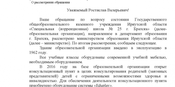 Номер жалобы:63638 Тип жалобы:Прочее Название объекта: Регион:Иркутская область Город:Братск Адрес:Комсомольская улица, 10В Описание жалобы:Коррекционная школа в ужасном состоянии, годами тут не было ремонта. Статус: