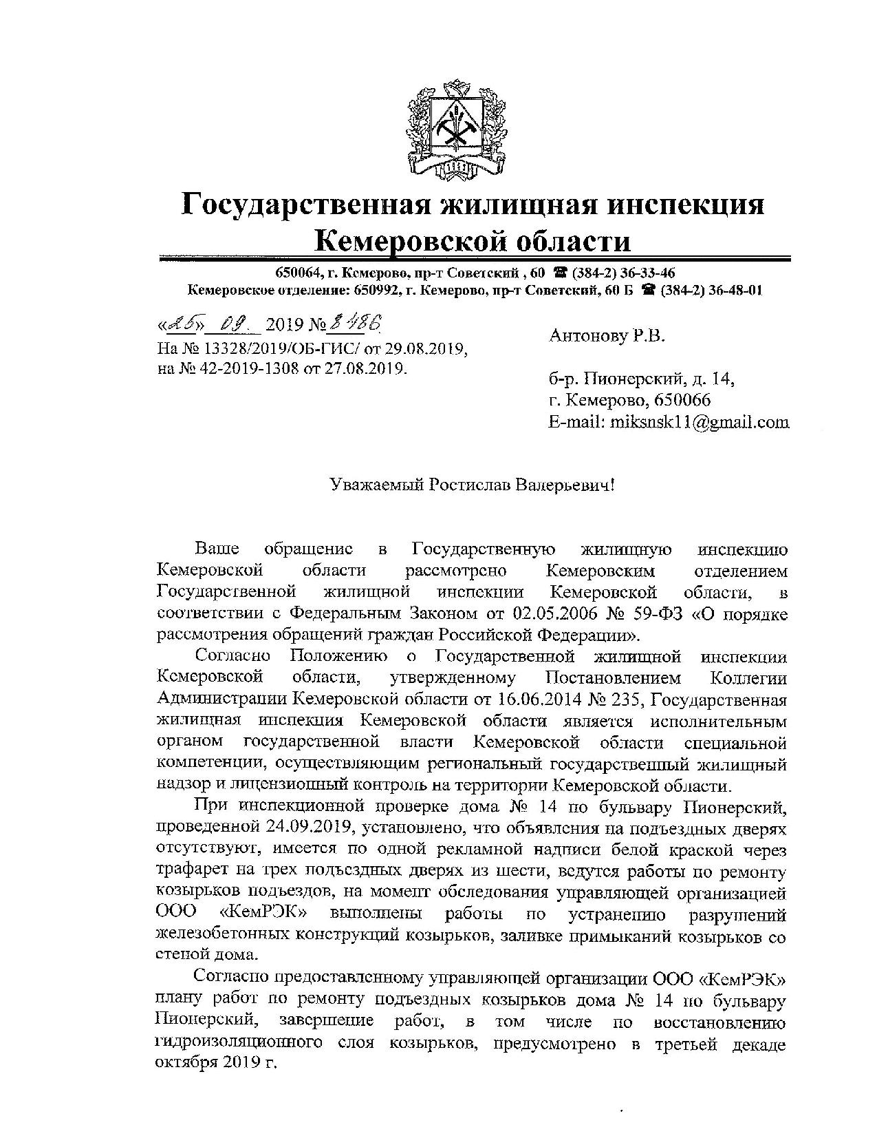 Номер жалобы:58900 Тип жалобы:Иные проблемы ЖКХ Название объекта: Регион:Кемеровская область Город:Кемерово Адрес:Пионерский бульвар, 14 Описание жалобы:ГЖИ Разрушения козырька подъезда и надписи на дверях подъезда Статус: