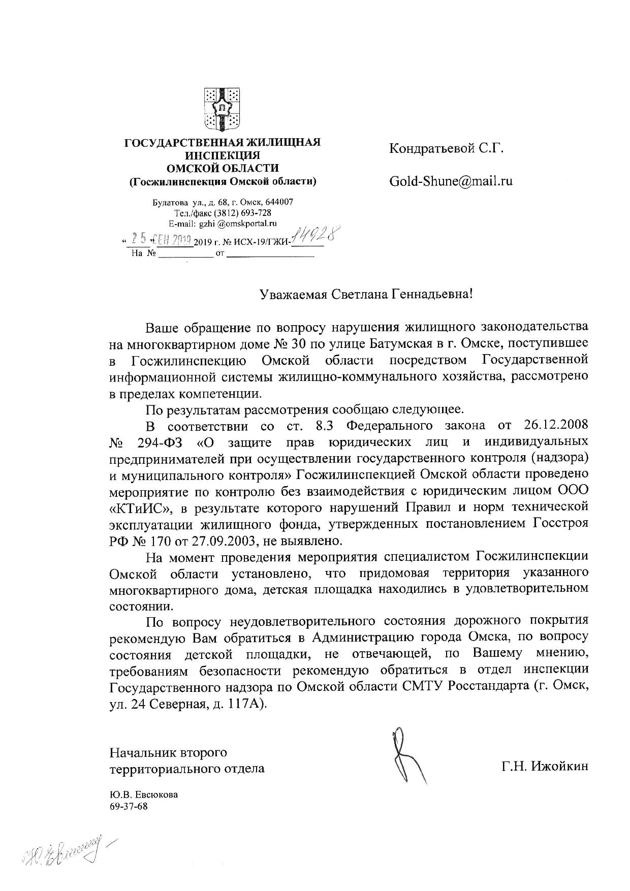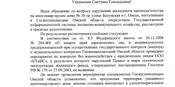 Номер жалобы:59137 Тип жалобы:Иные проблемы ЖКХ Название объекта: Регион:Омская область Город:Омск Адрес:Батумская улица, 30 Описание жалобы:Управляющая компания ООО КТиИС запустили дом по адресу Батумская 30 район (район ст. Московка) огромные ямы , не соответсвующие ГОСТУ железные прутья торчащие из бордюров, опасная детская площадка , качели не отвечающие требованиям безопасности . Статус: