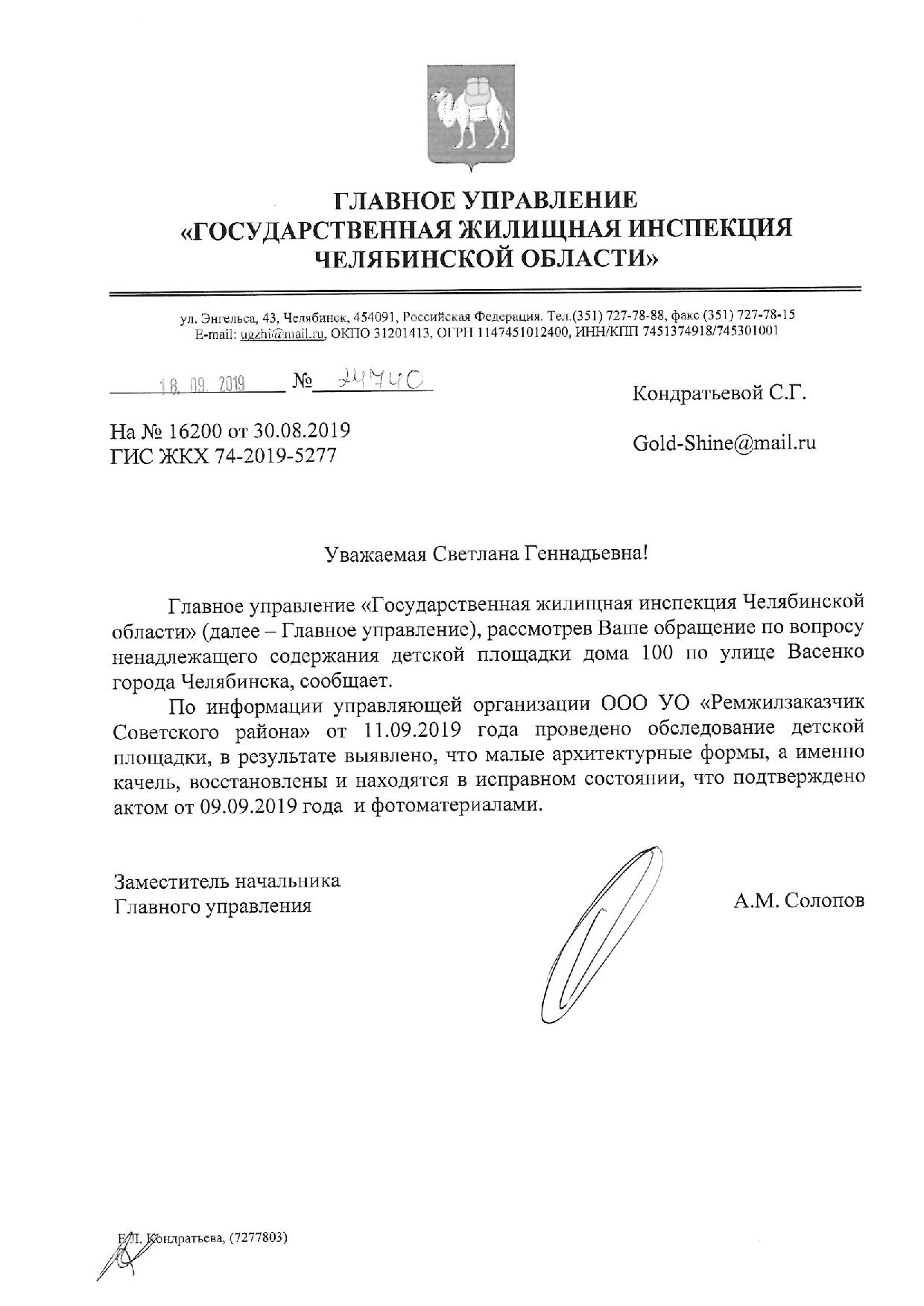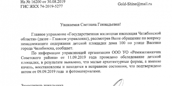 Номер жалобы:59142 Тип жалобы:Иные проблемы ЖКХ Название объекта: Регион:Челябинская область Город:Челябинск Адрес:улица Васенко, 100 Описание жалобы:Во дворе дома, находящегося по адресу: г. Челябинск, ул. Васенко, 100, расположена детская площадка. Однако "подвесные качели" находятся в неудовлетворительном состоянии. Прошу починить качели. Статус: