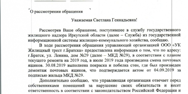 Номер жалобы:59154 Тип жалобы:Иные проблемы ЖКХ Название объекта: Регион:Иркутская область Город:Братск Адрес:проспект Ленина, 29 Описание жалобы:После замены почтовых ящиков,ремонт подъезда не восстановлен Статус: