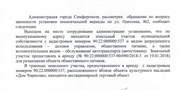 Номер жалобы:63009 Тип жалобы:Прочее Название объекта: Регион:Республика Крым Город:Симферополь Адрес:Одесская улица, 2 Описание жалобы:Изменен фасад исторического здания, сделан пристрой-веранда кафе, прошу выдать предписание на демонтаж Статус: