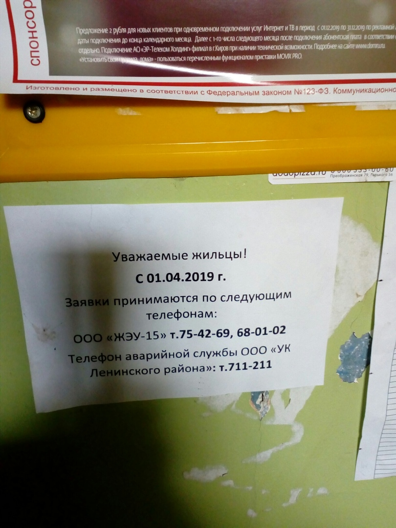 Номер жалобы:62921 Тип жалобы:Прочее Название объекта: Регион:Кировская область Город:Киров Адрес:Щорса, 52 Описание жалобы:Расклейка объявлений в подъезде,в местах для этого не предназначенных. Статус: