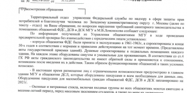Номер жалобы:62946 Тип жалобы:Прочее Название объекта: Регион:Москва Город:Москва Адрес:микрорайон Ленинские Горы, 1 Описание жалобы:В нарушение постановления Постановления Главного государственного санитарного врача Российской Федерации от 23 марта 2011 г. N 23 г. Москва "Об утверждении СП 2.1.2.2844-11 "Санитарно-эпидемиологические требования к устройству, оборудованию и содержанию общежитий для работников организаций и обучающихся образовательных учреждений"":