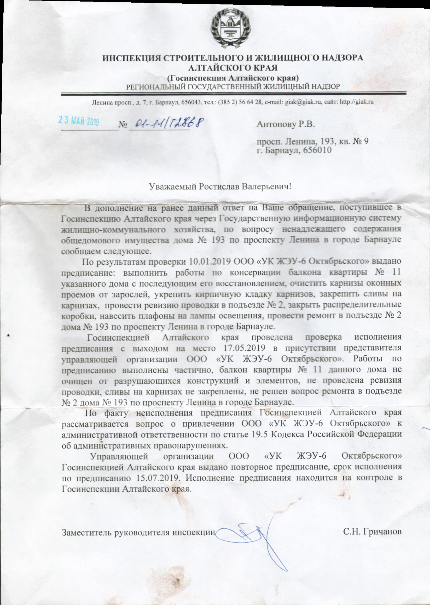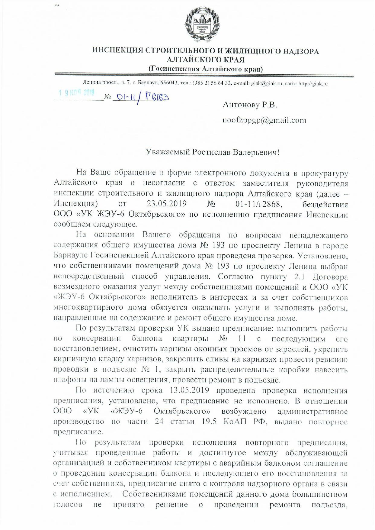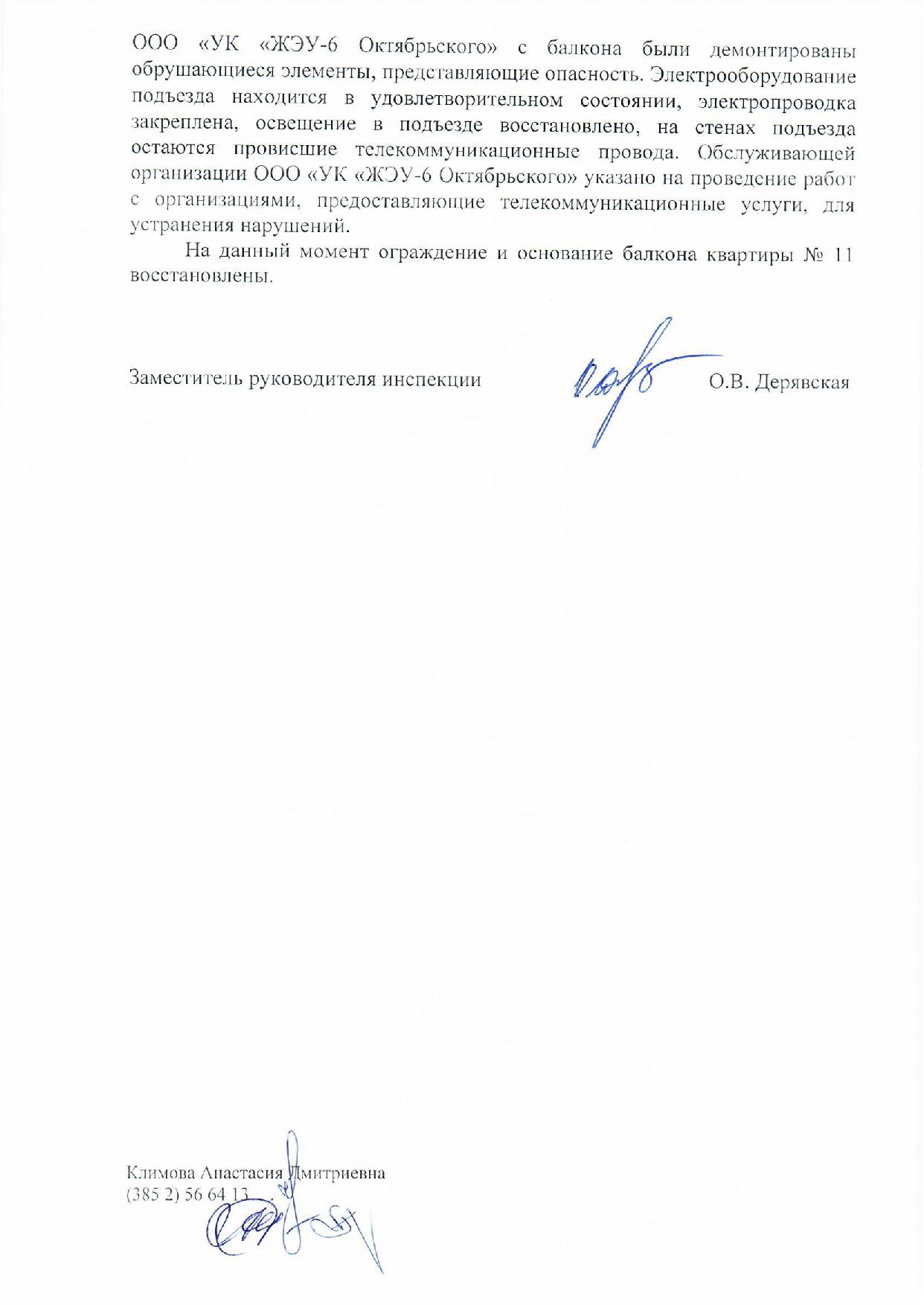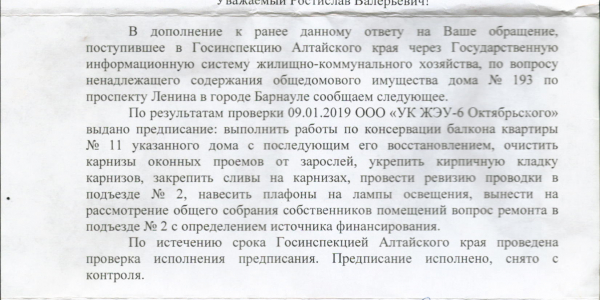 Номер жалобы:58574 Тип жалобы:Иные проблемы ЖКХ Название объекта:ООО "УК ЖЭУ-6 Октябрьского" Регион:Алтайский край Город:БАРНАУЛ Адрес:пр-т Ленина, 193 Описание жалобы:10.01.2019 было выдано предписание Госинспекцией Алтайского края на выполнения следующих работ по адресу: г. Барнаул проспект Ленина, 193-9. УК ЖЭУ дожна была выполнить следующие виды работ: Выполнить работы по косервации балкона квартиры №11 с последующим его восстановлением, очистить карнизы оконных проемов от зарослей, укрепить кирпичную кладку карнизов.ю закрепить сливы на карнизах, произвести ревизию проводки в подъезде, закрыть распред.коробки, навесить плафоны на лампы освещения, произвести ремонт в подъезде. Из всего выше перечисленного было сделано: разобран балкон без восстановления , навешаны плафоны. Больше ничего сделано не было.