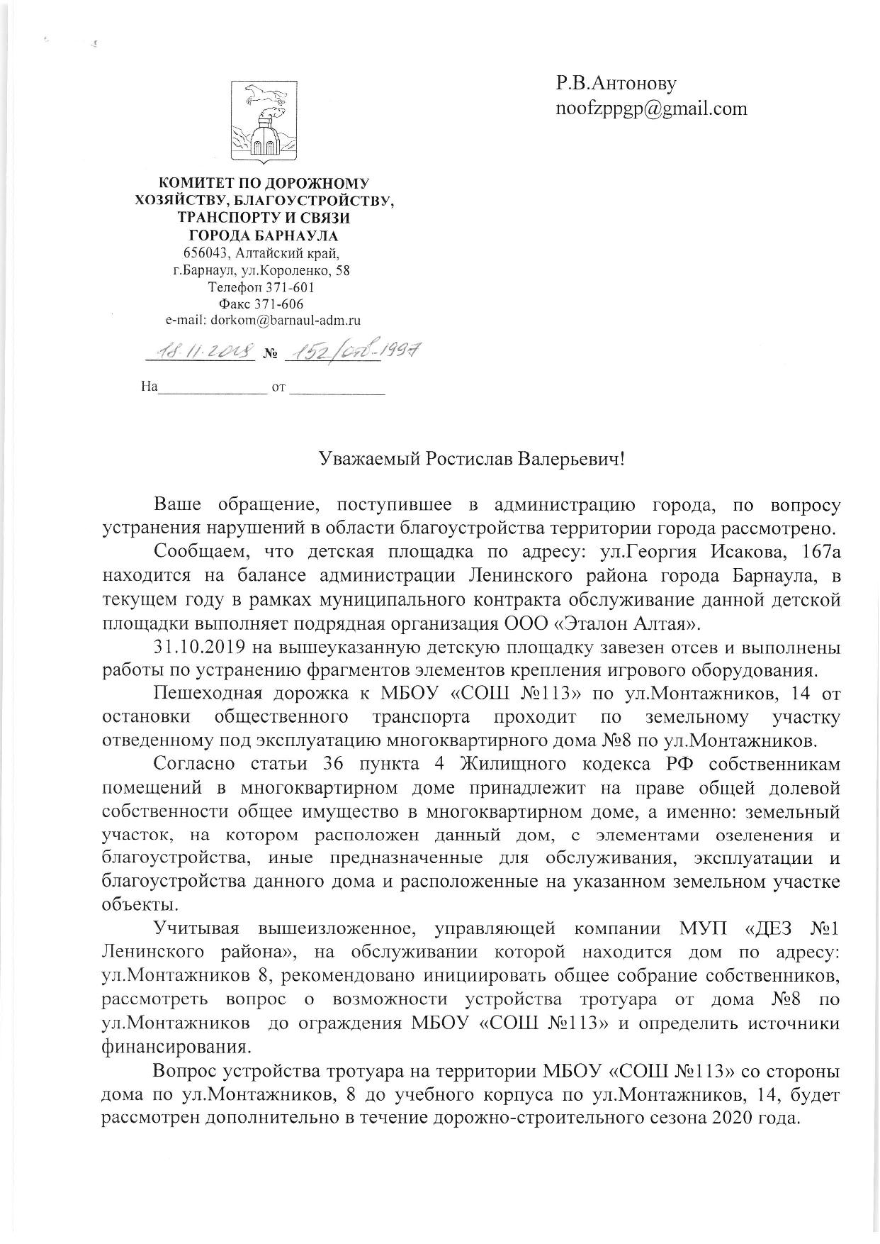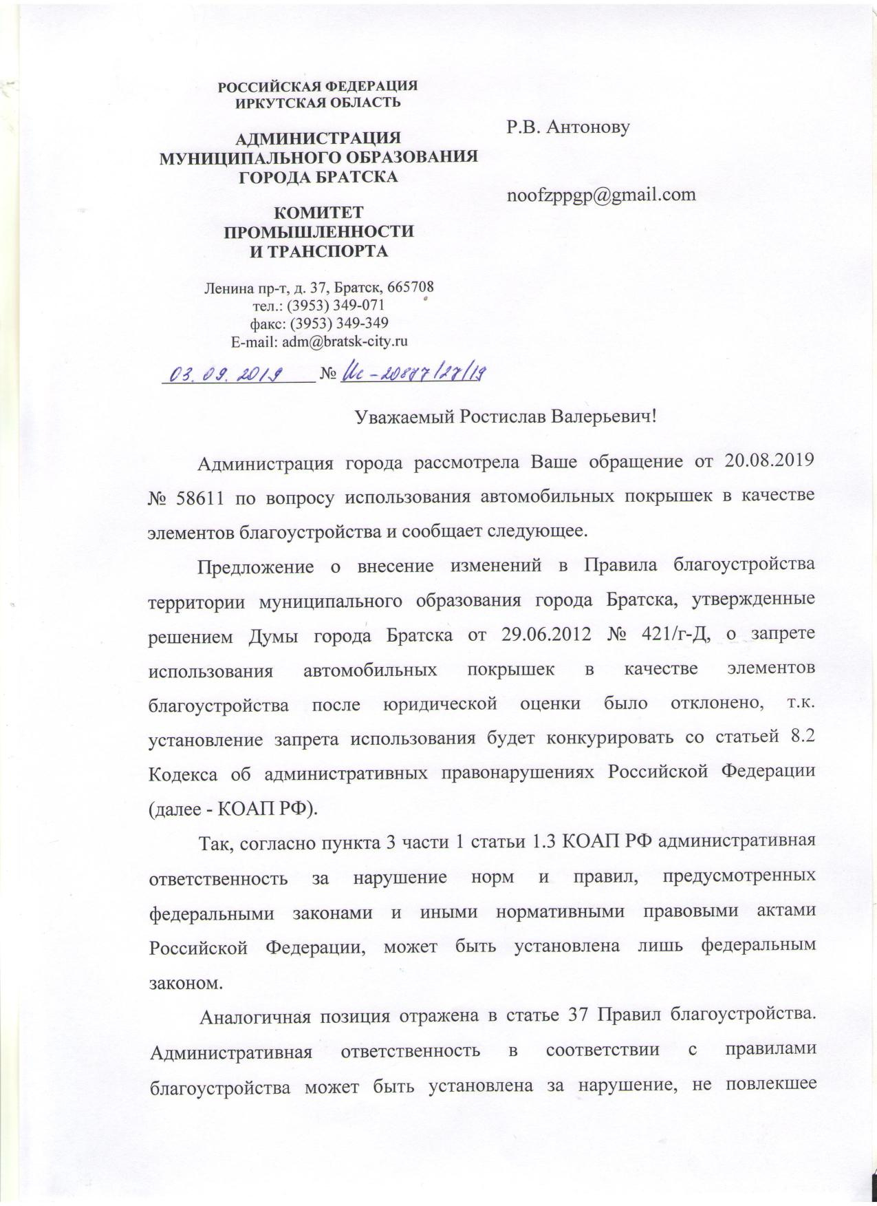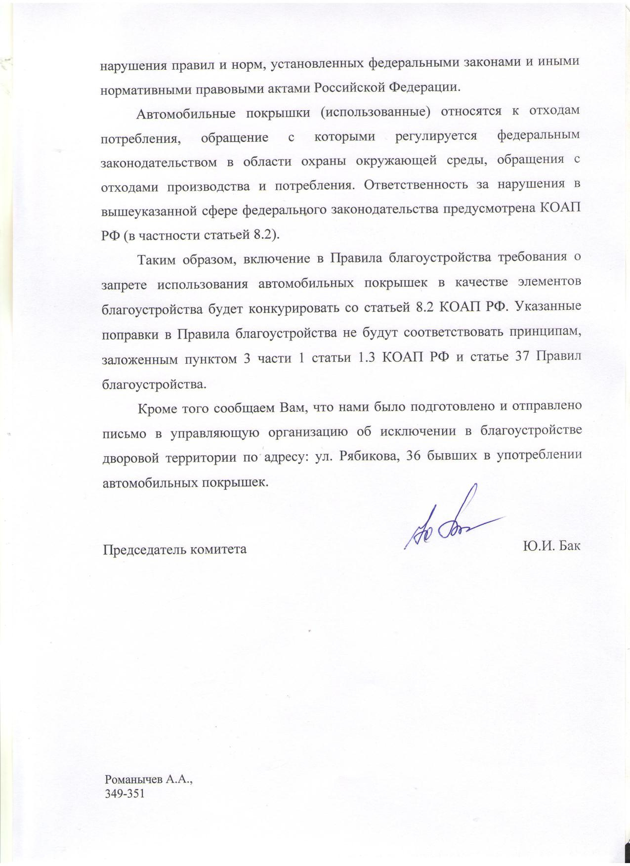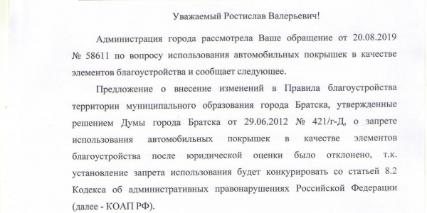 Номер жалобы:58611 Тип жалобы:Иные проблемы ЖКХ Название объекта: Регион:Иркутская область Город:Братск Адрес:улица Рябикова, 36 Описание жалобы:Использование опасных отходов 4го класса (автомобильные шины) в качестве элементов благоустройства. В природоохранную прокуратуру Братска Статус: