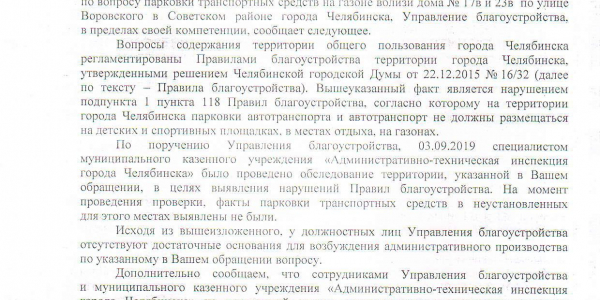 Номер жалобы:58563 Тип жалобы:Иные проблемы ЖКХ Название объекта: Регион:Челябинская обл. Город:Челябинск Адрес:улица Воровского, 17В Описание жалобы:Парковка на газоне Статус: