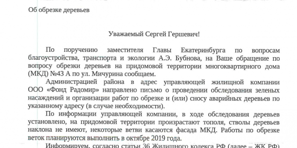 Номер жалобы:58575 Тип жалобы:Иные проблемы ЖКХ Название объекта: Регион:Свердловская область Город:Екатеринбург Адрес:улица Мичурина, 43А Описание жалобы:Тополя во дворе все заражены тополиной тлей. Есть риск быстрого вымирания и падения на жителей ! Необходима срочная обрезка или полный спил ! Статус: