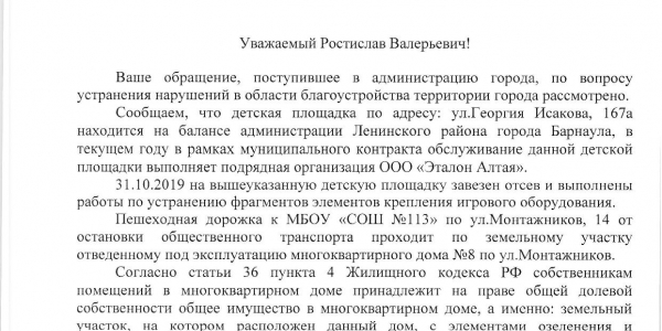 Номер жалобы:58578 Тип жалобы:Иные проблемы ЖКХ Название объекта: Регион:Chelyabinskaya oblast Город:Chelyabinsk Адрес:Chelyabinsk, shosse Metallurgov, 29 Описание жалобы:Во дворе дома, находящегося по адресу: г. Челябинск, ш. Металлургов, 29, расположена площадка для воркаута. К сожалению, она частично непригодна для занятий спортом, а именно: у одного тренажёра не закреплено сиденье, у другого - откручена спинка, хотя раньше была на двух болтах из четырёх. Прошу Вас привести данную спортплощадку в надлежащее состояние (лучше используйте те болты, которые не смогут открутить посиоронние). Статус: Вложенные файлы: