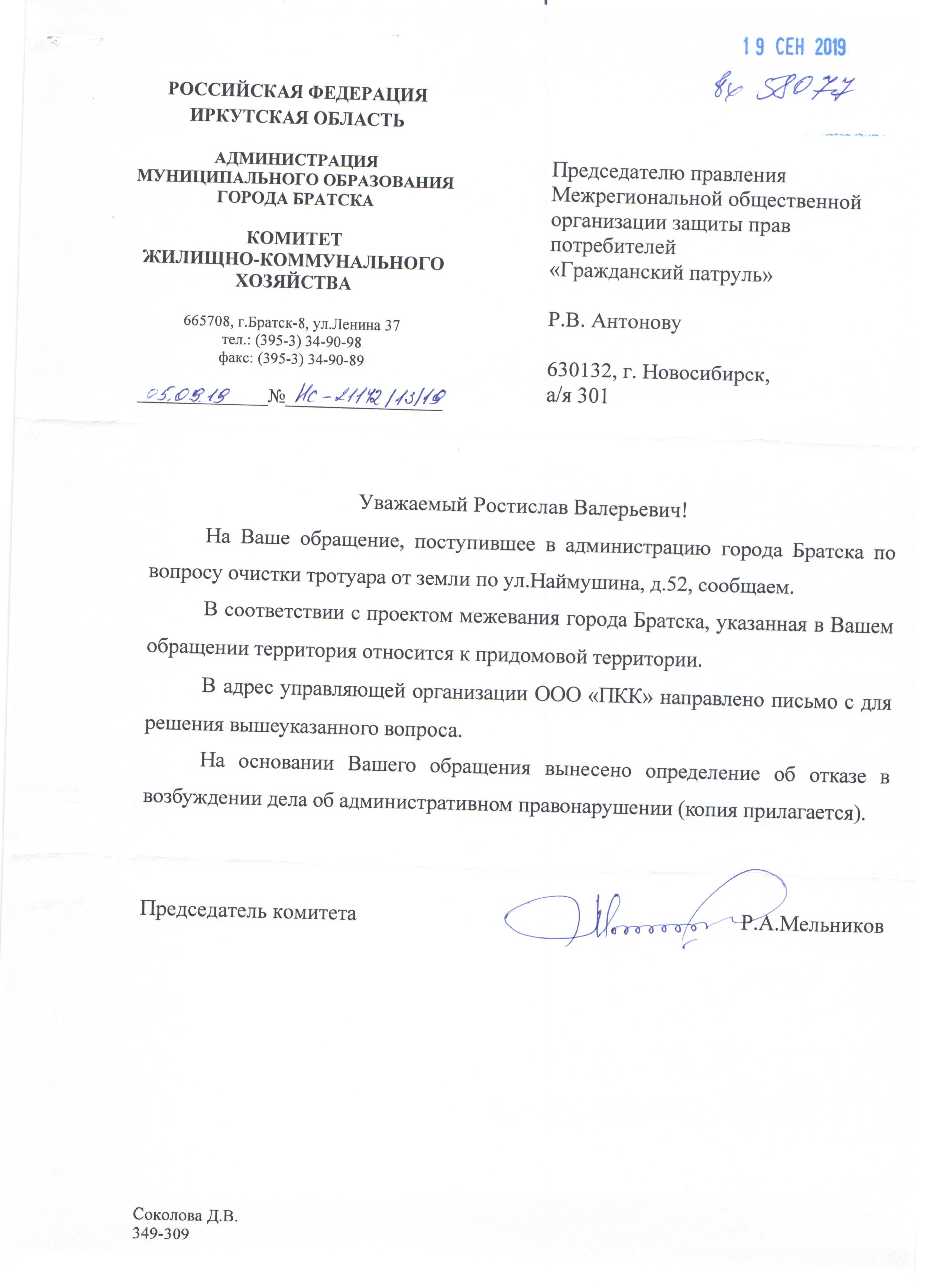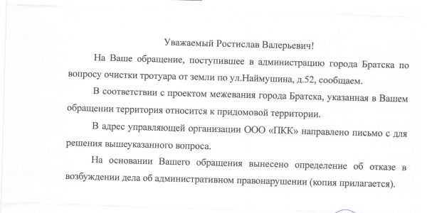 Номер жалобы:58077 Тип жалобы:Иные проблемы ЖКХ Название объекта: Регион:Иркутская область Город:Братск Адрес:улица Наймушина, 52 Описание жалобы:Некачественно выполнена очистка тротуара от земли во вдоре Статус: