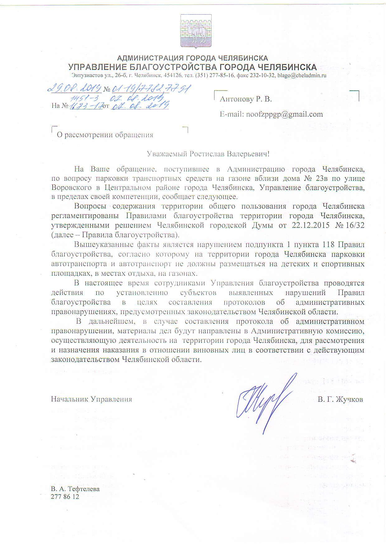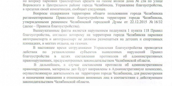 Номер жалобы:58239 Тип жалобы:Иные проблемы ЖКХ Название объекта: Регион:Челябинская область Город:Челябинск Адрес:улица Воровского, 23В Описание жалобы:Необходимо оштрафовать водителя, который паркуется на газоне во дворе. Статус:
