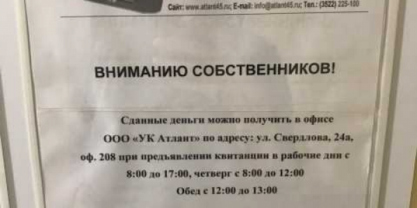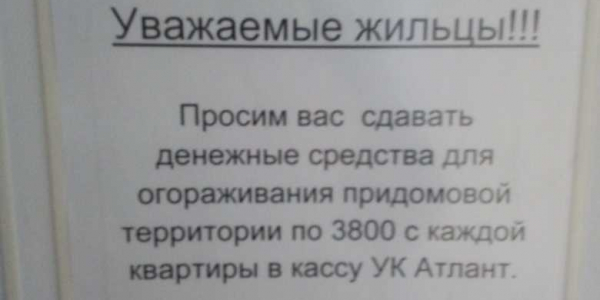 Номер жалобы:58196 Тип жалобы:Иные проблемы ЖКХ Название объекта: Регион:Курганская область Город:Курган Адрес:улица Алексеева, 16В Описание жалобы:Управляющая компания "Атлант"собирала средства на ограждение территории домов по адресу ул.Алексеева 16 в. и дом г. без сметы и разрешения выставили сумму 3800,провели голосование,большинство собственников были за ограждение,но за три дня до окончания сбора средств отказались в помощи собственникам,мотевирую тем,что им это не надо Статус:
