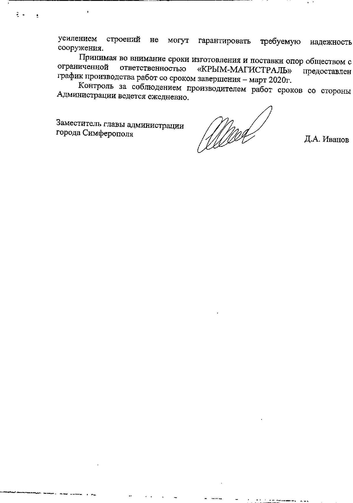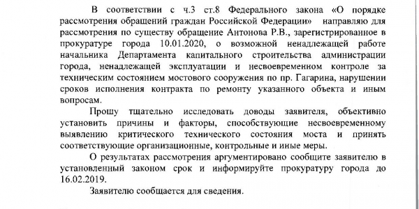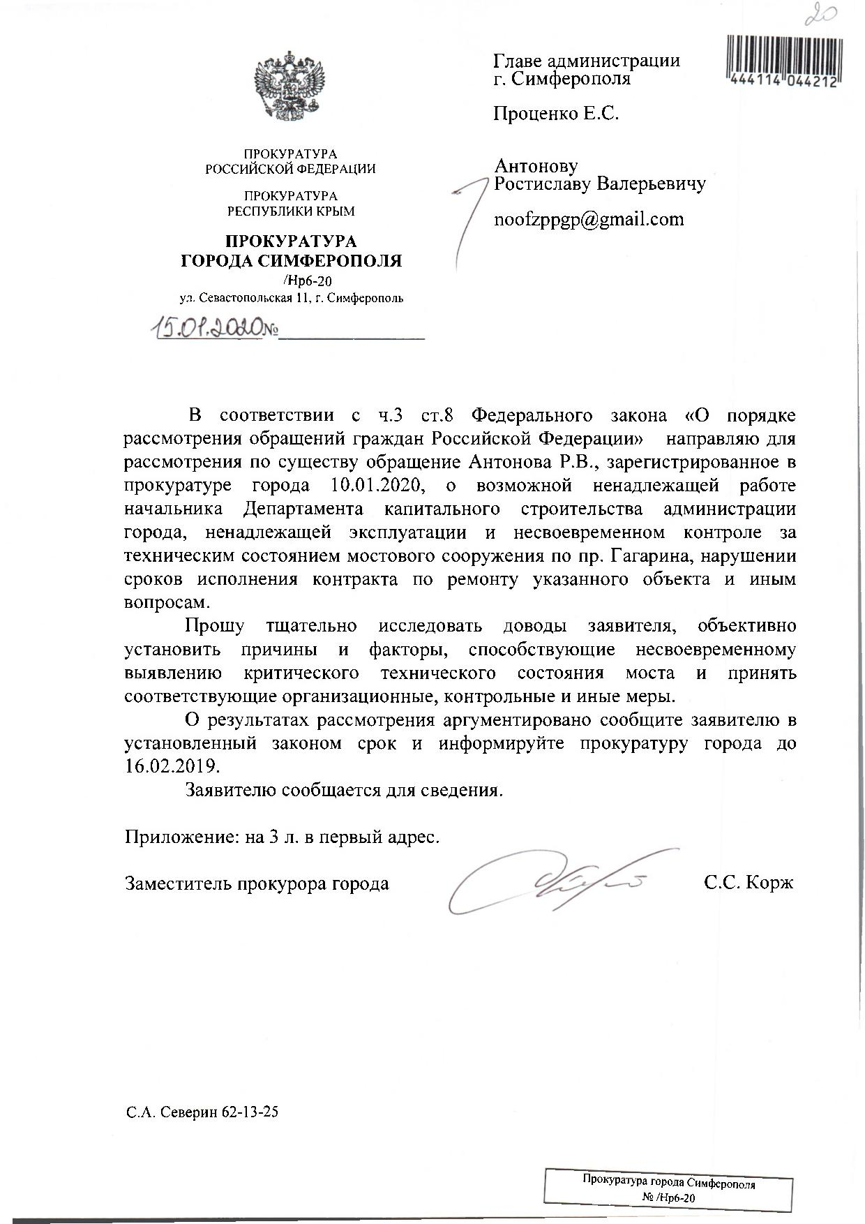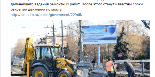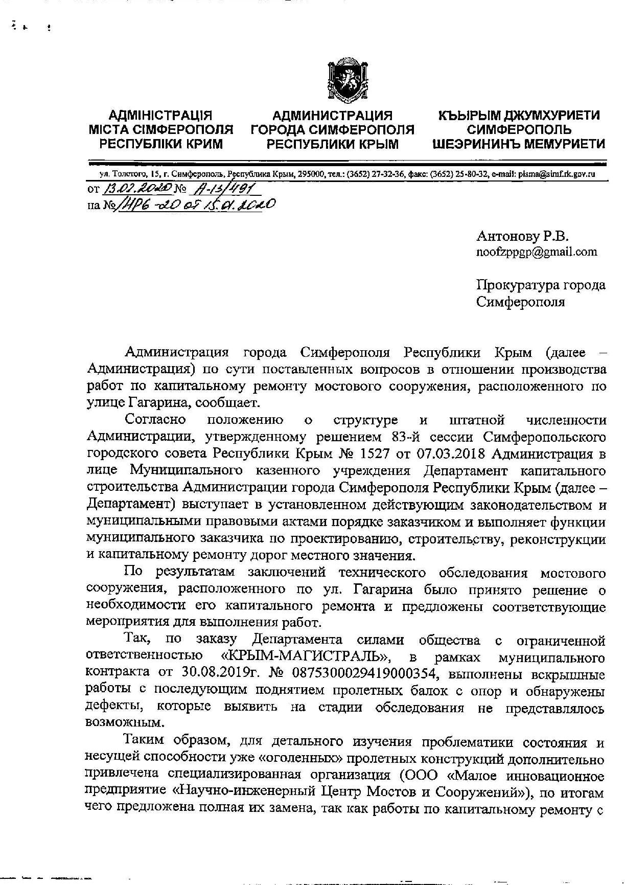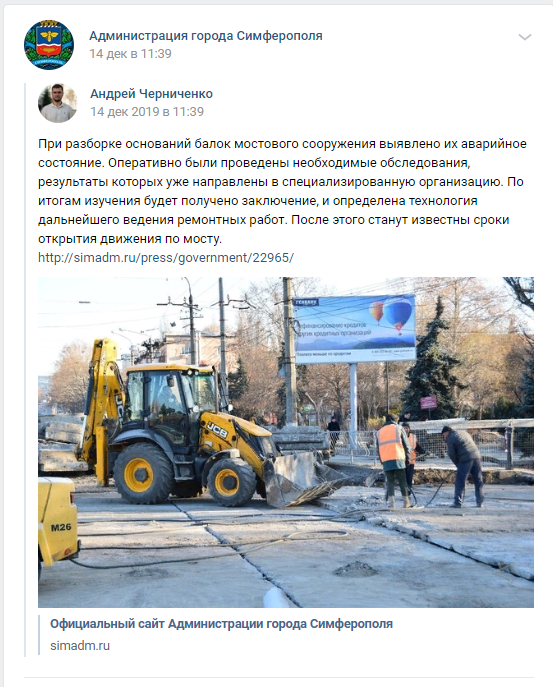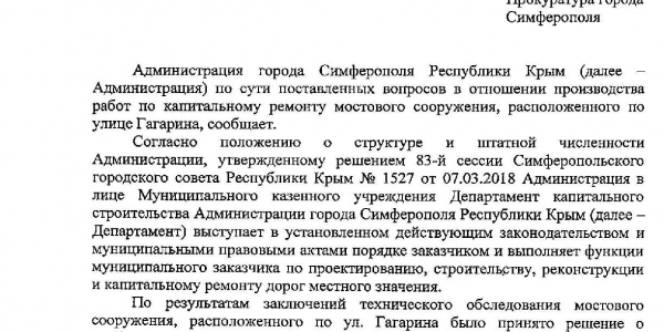 В Техническом задание указан срок производства работ, окончание: 31.10.2019 года, на 17.12.2019 капитальный ремонт не начат. О чем сообщается на сайте Администрации Симферополяпо ссылке https://vk.com/wall-126705666_11067. Движение перекрыто, сроки окончания ремонтных работ неизвестны. Прошу провести проверку в отношении ответственных лиц за ненадлежащую эксплуатацию мостового сооружения, а также мостовых сооружений на территории г. Симферополь, в том числе начальника Департамента капитального строительства Администрации города Симферополя А.В. Кудряшова