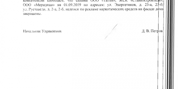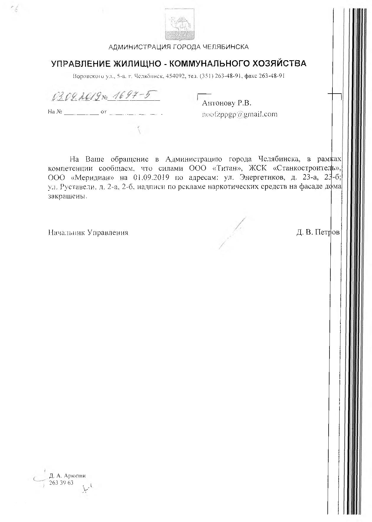 Номер жалобы:57950 Тип жалобы:Иные проблемы ЖКХ Название объекта: Регион:Челябинская область Город:Челябинск Адрес:улица Энергетиков, 23А Описание жалобы:1697-5 Ненадлежащее содержание фасада здания, реклама наркотических средств. Адреса: Энергетиков 23а, 23б. Шота руставели: 2а, 2б. Статус: