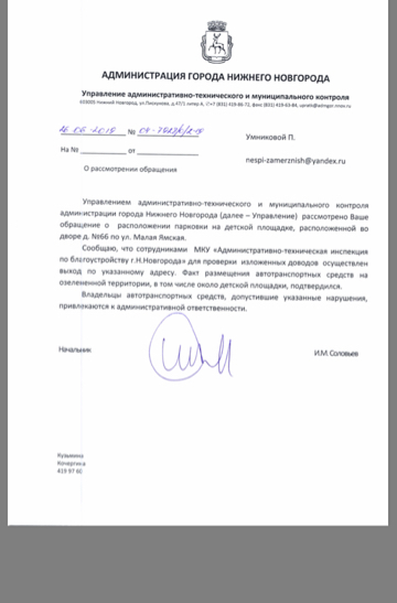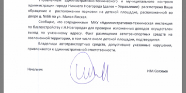 Номер жалобы:57988 Тип жалобы:Иные проблемы ЖКХ Название объекта: Город:Нижний Новгород Адрес:Нижний Новгород, Малая Ямская улица, 66 Описание жалобы:Добрый день. Во дворе по адресу г. Нижний Новгород, ул.Малая Ямская 66 жители домов устроили самовольную парковку на детской площадке и газоне. Мною была направлена жалоба в администрацию города, получен ответ, но ситуация не изменилась. Ограждение, мешающее заезжать внутрь зеленой зоны двора, где находится детская площадка, не поставлено. Иной вариант решения проблемы также не предложен. Фото двора и ответа администрации во вложении. Статус: