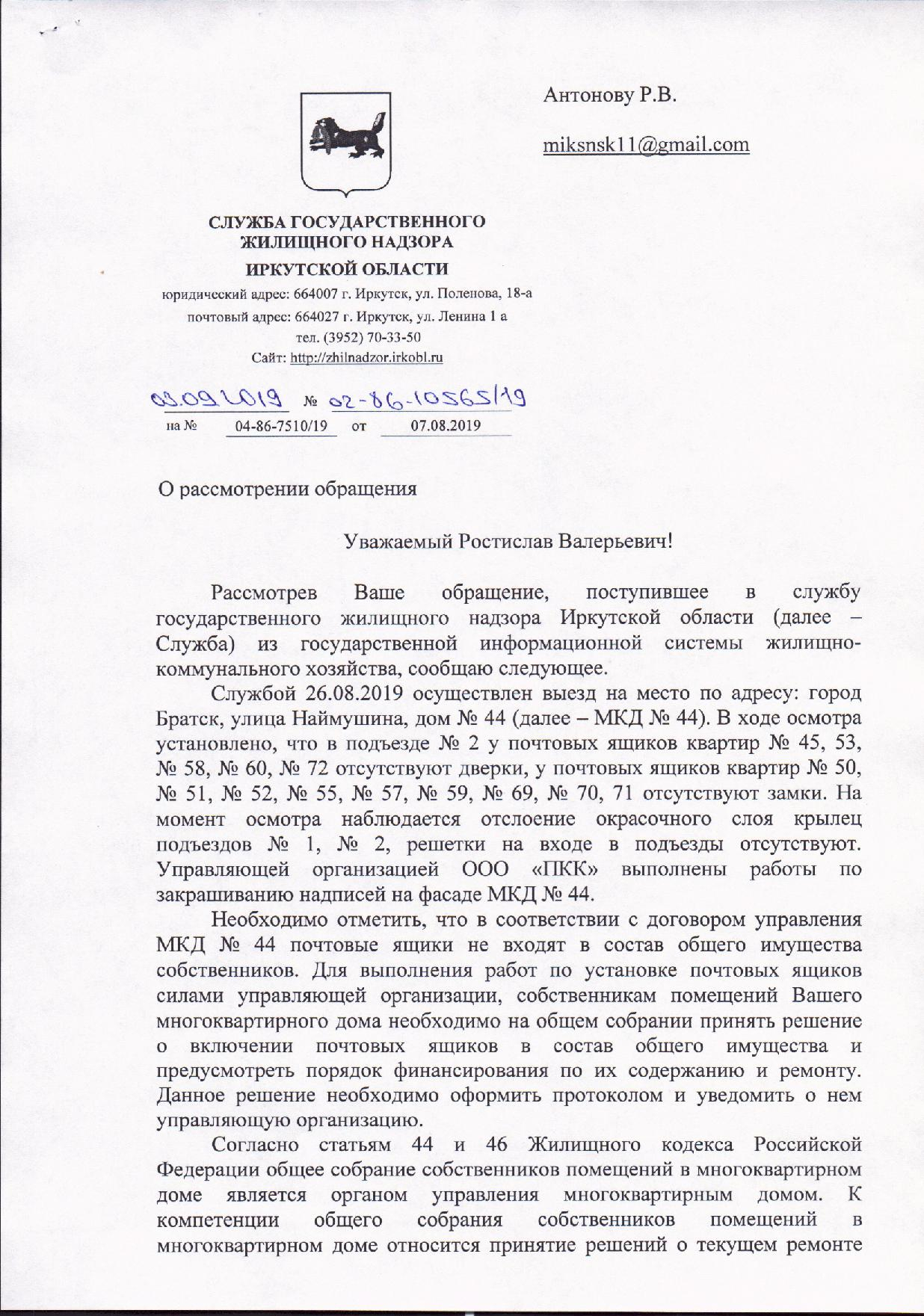 Номер жалобы:58052 Тип жалобы:Иные проблемы ЖКХ Название объекта: Регион:Иркутская область Город:Братск Адрес:улица Наймушина, 44 Описание жалобы:Во втором подъезде необходима замена почтовых ящиков Статус: