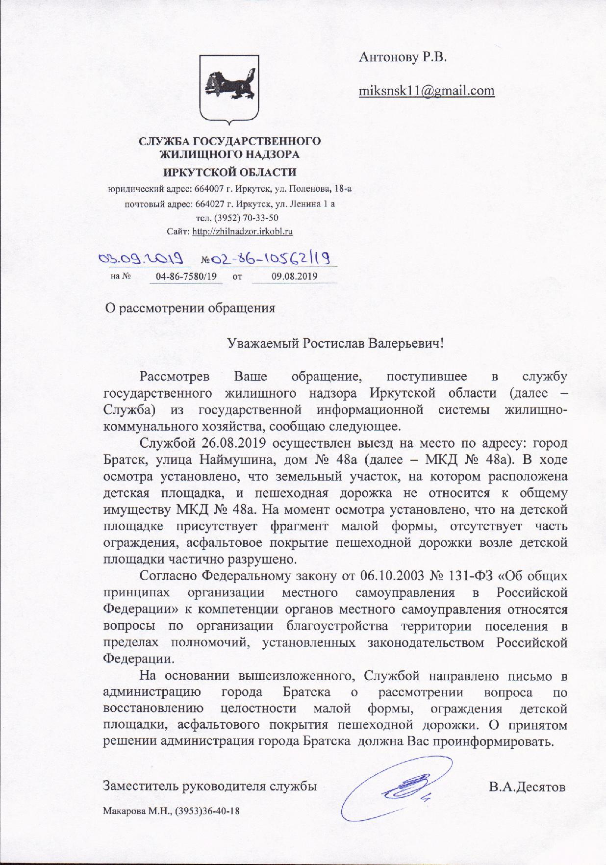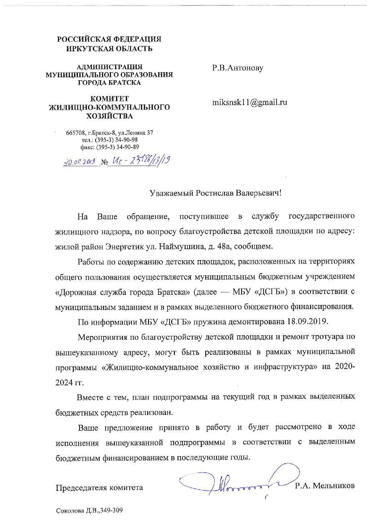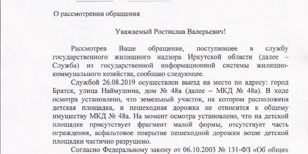 Номер жалобы:58076 Тип жалобы:Иные проблемы ЖКХ Название объекта: Регион:Иркутская область Город:Братск Адрес:улица Наймушина, 48А Описание жалобы:На детской площадки около дороги демонтировали два секции забора, отделяющего площадку от дороги. Теперь дети бегают во время игры через дороги, создавая риск возникновения ДТП. До сих пор управляющей компанией не восстановлена качалка на пружине. Остался только острый оголовок. Тротуар рядом с площадкой частично разрушен. Статус: