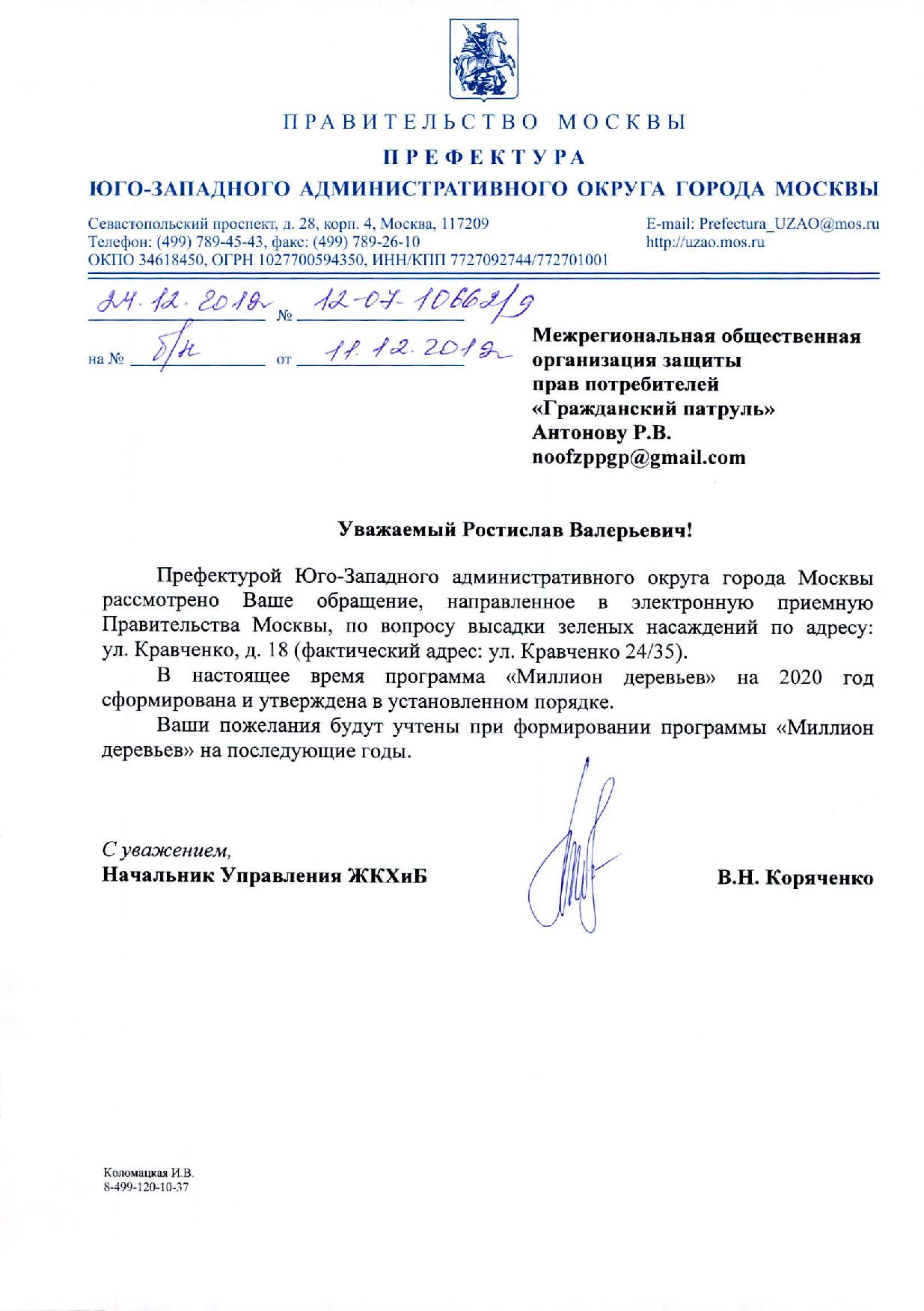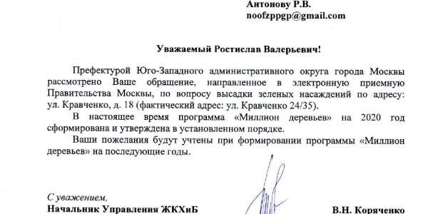 Номер жалобы:62314 Тип жалобы:Прочее Название объекта: Регион:Москва Город:Москва Адрес:улица Кравченко, 18 Описание жалобы:Требуется дополнительно высадить несколько деревьев на зелёном пятачке между домом по адресу, улицей и двумя проездами. Статус: