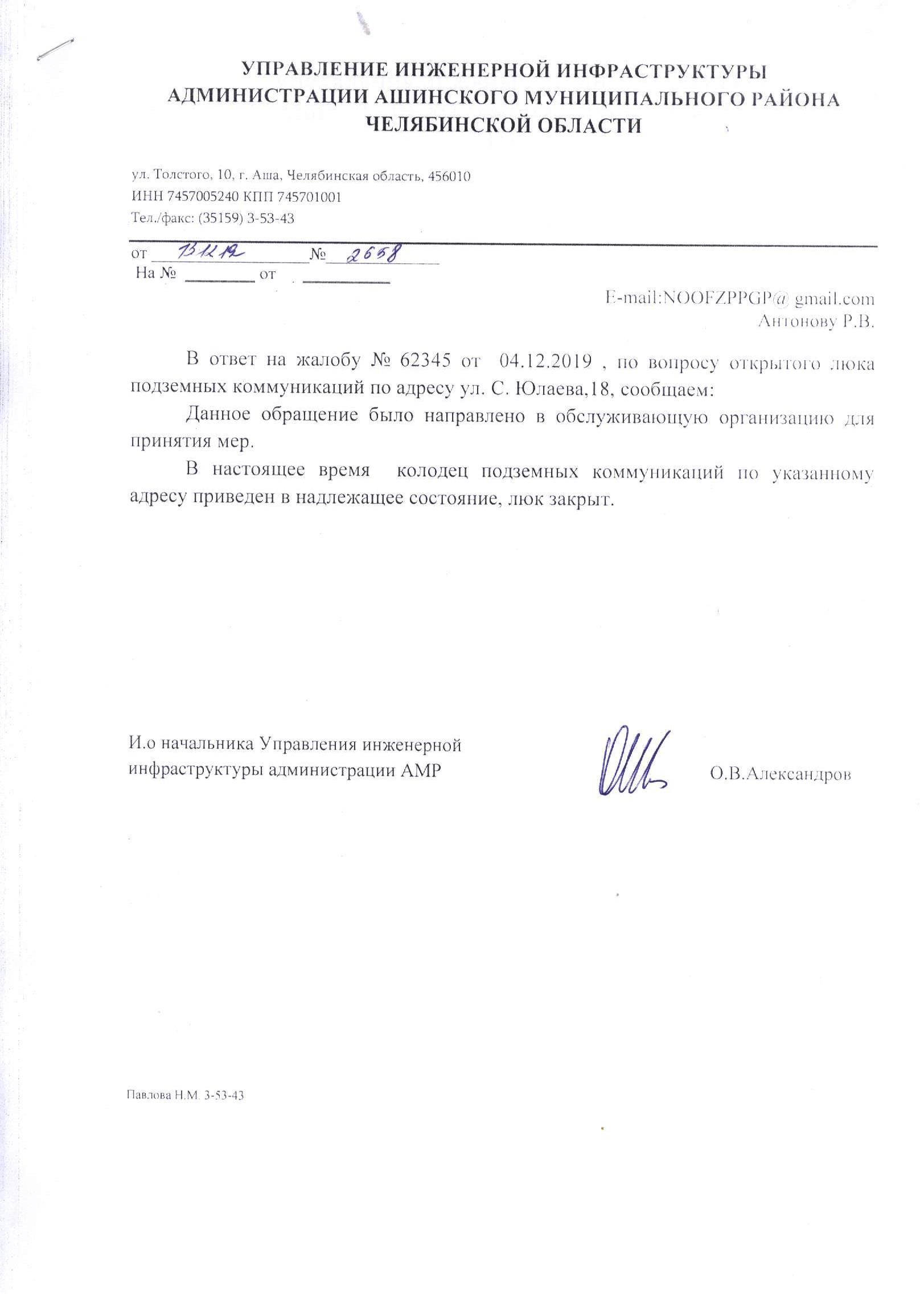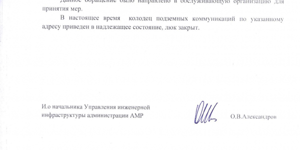 Номер жалобы:62345 Тип жалобы:Прочее Название объекта: Регион:Челябинская область Город:Аша Адрес:улица Салавата Юлаева, 18 Описание жалобы:Открытый люк возле жилого дома Статус:
