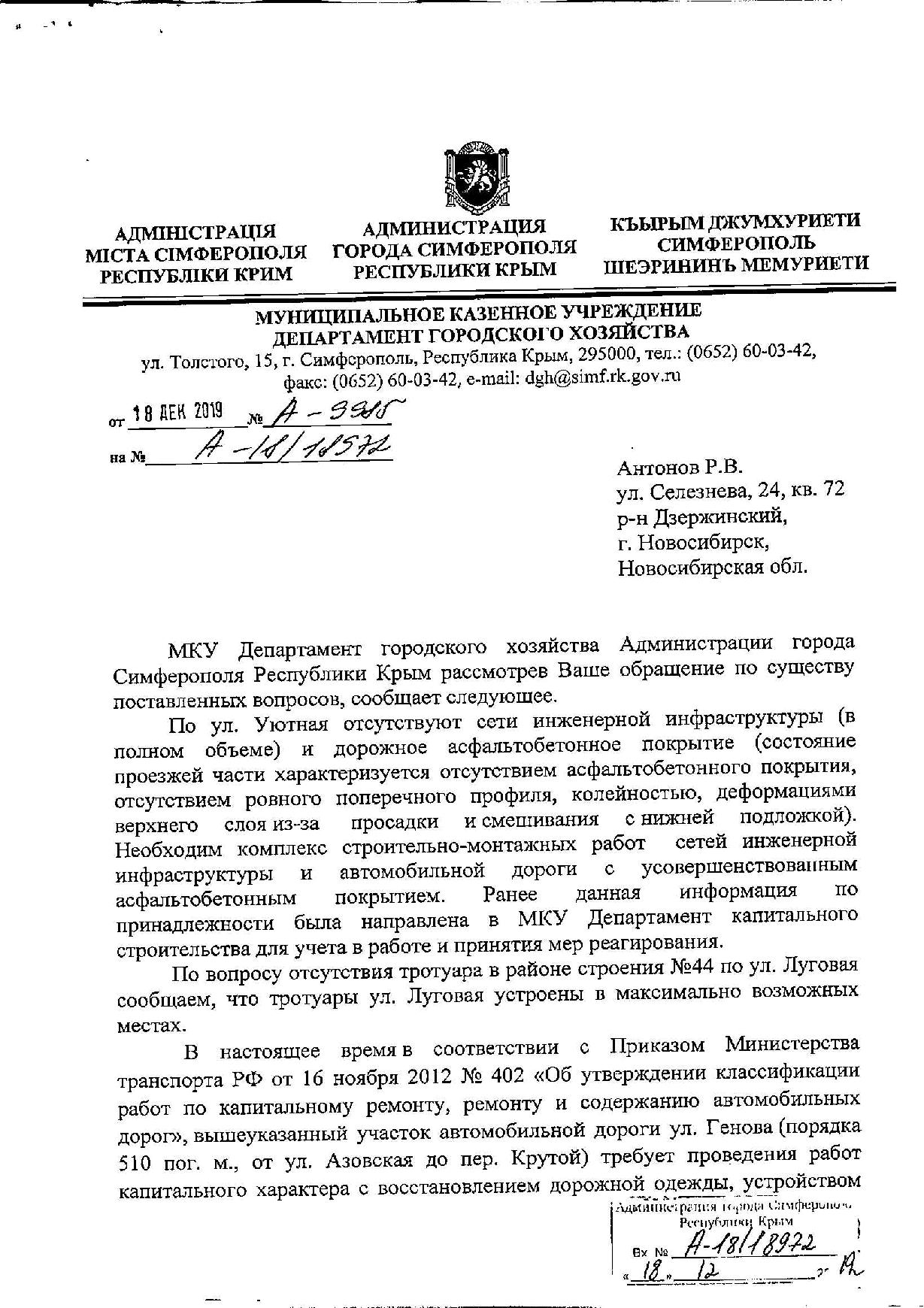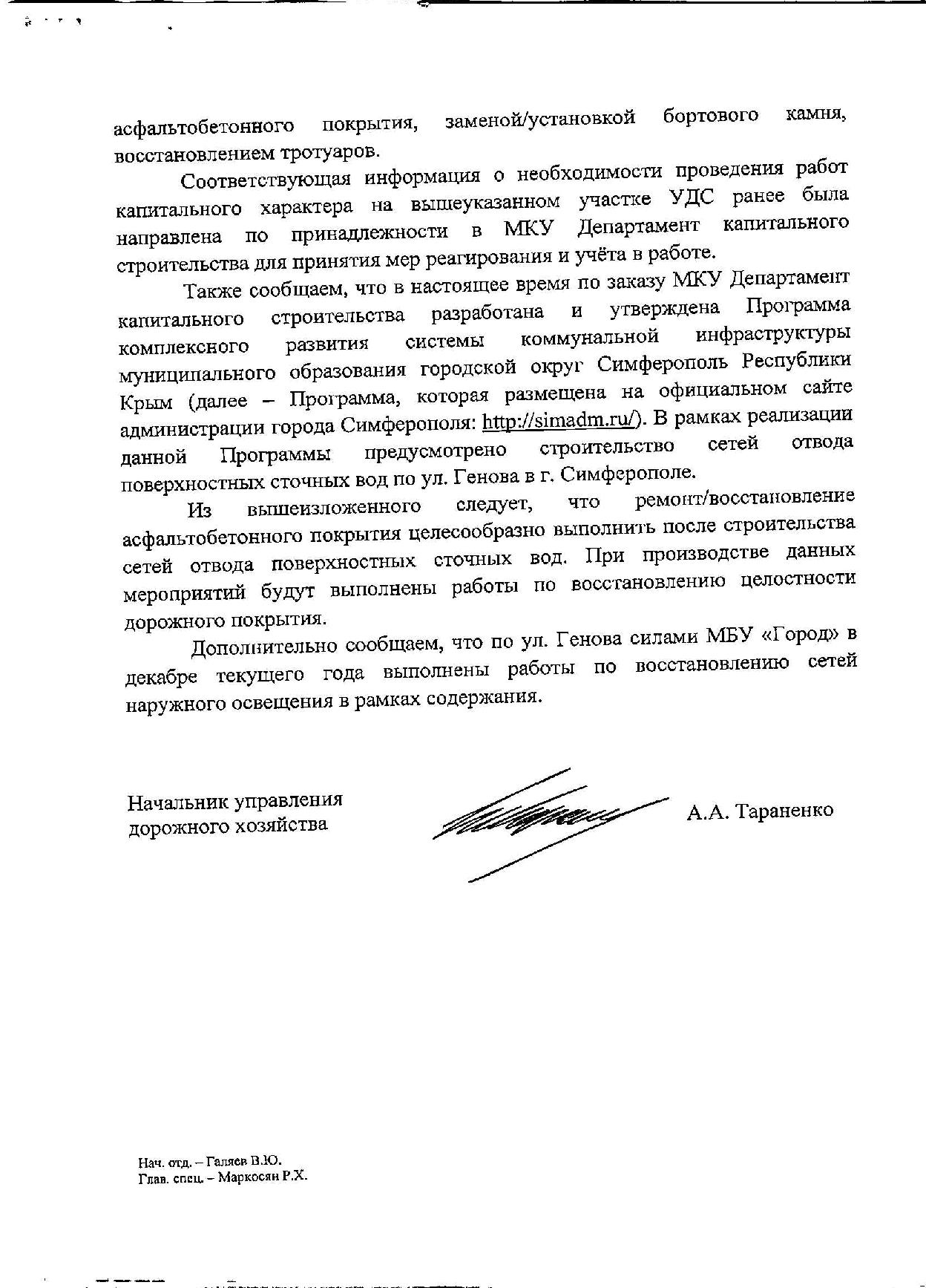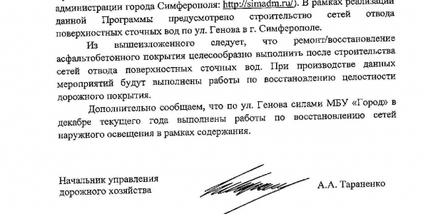 Номер жалобы:62165 Тип жалобы:Прочее Название объекта:Администрация Симферополя Регион:Республика Крым Город:Симферополь Адрес:улица Генова, 122 Описание жалобы:Прошу довести до логического завершения ремонт улицы Генова 121 а, б: