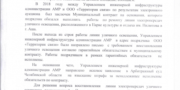 Прошу принять меры по устройству освещения детской площадки и указать сроки.
