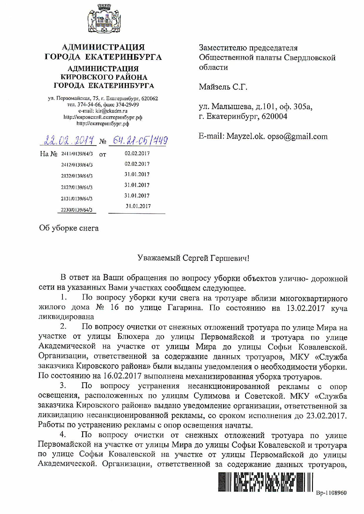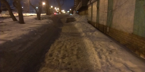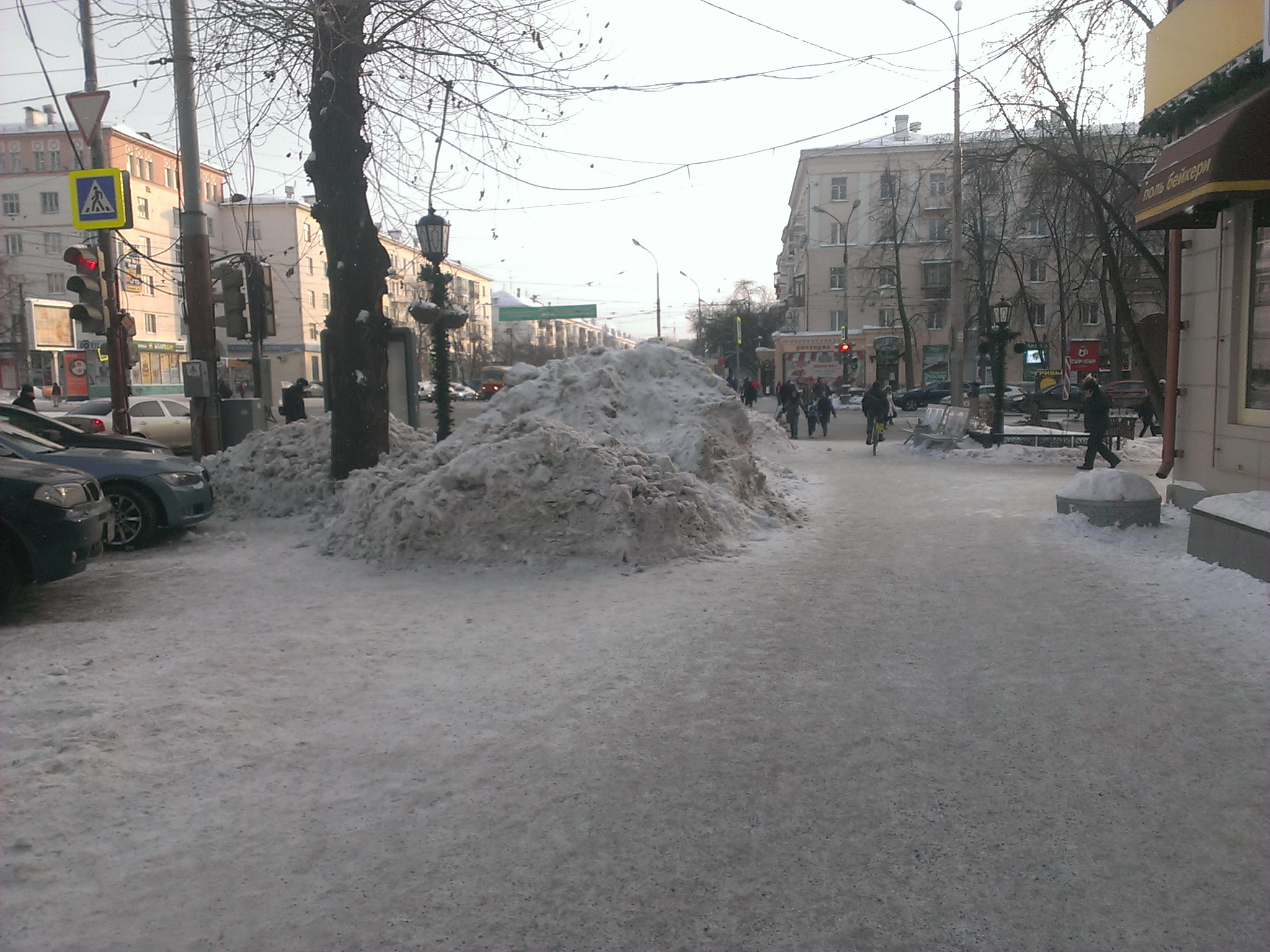 Номер жалобы:14003 Тип жалобы:Качество уборки снега на тротуарах Название объекта:Администрация Екатеринбурга Регион:Свердловская область Город:Екатеринбург Адрес:улица Софьи Ковалевской Описание жалобы:Отсутствует уборка снега на тротуарах с обеих сторон улицы Мира на участке от улицы Первомайской до площади Кирова, а также на тротуарах с обеих сторон улицы Софьи Ковалевской на участке от улицы Первомайской до улицы Академической. Тротуары покрыты толстым слоем уплотнённого снега, не расчищены проходы к парковочным карманам. Особо опасная ситуация сложилась на нечётной стороне улицы Мира между домами Первомайская, 90 и Мира, 17, где по центру тротуара накатана ледяная дорожка. Статус: