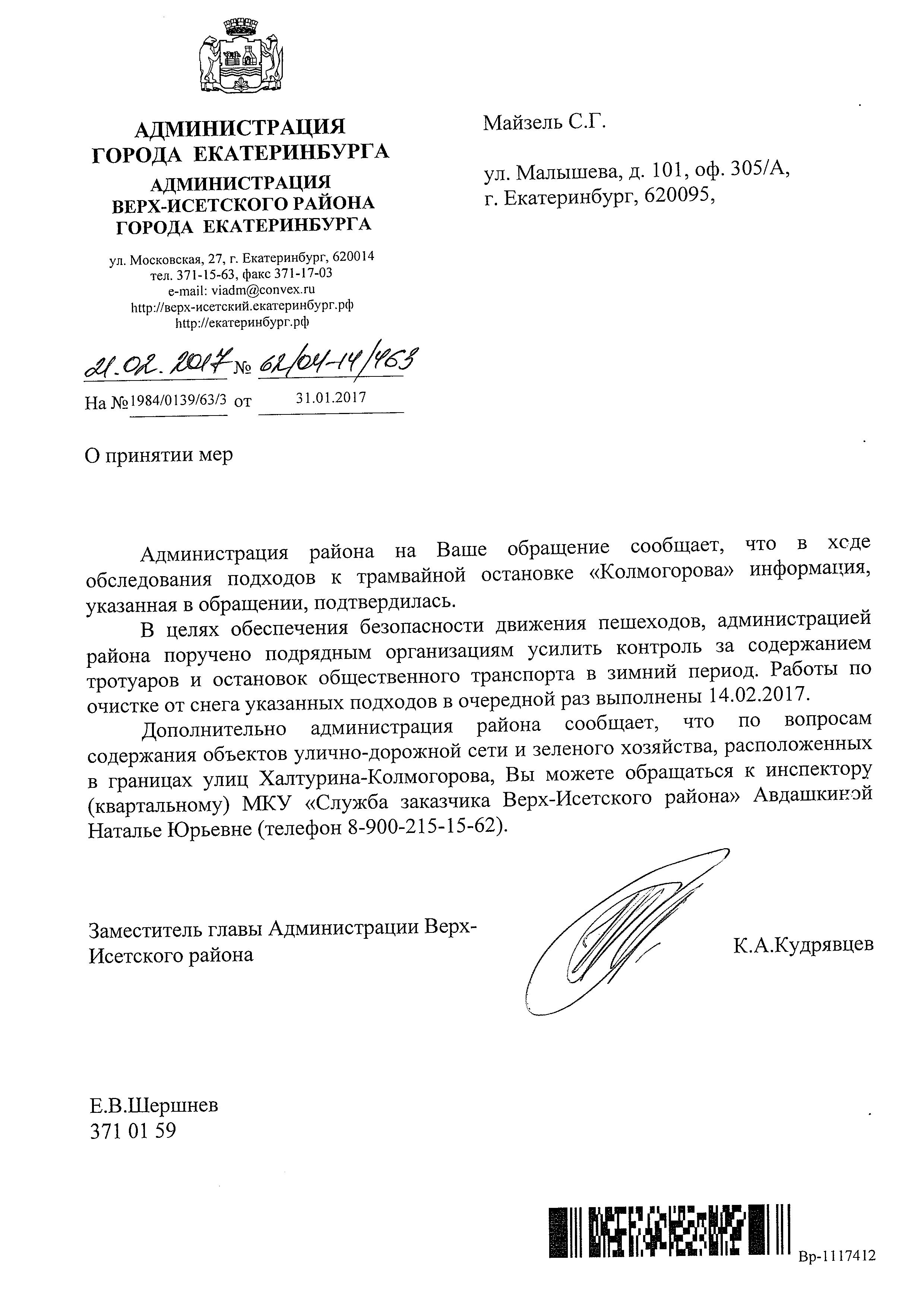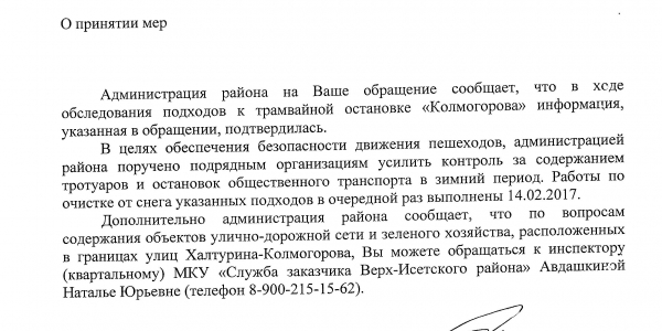 Номер жалобы:14001 Тип жалобы:Качество уборки снега на тротуарах Название объекта:Администрация Екатеринбурга Регион:Свердловская область Город:Екатеринбург Адрес:улица Колмогорова Описание жалобы:Тротуар, ведущий от трамвайной остановки «Колмогорова» к дому 10а по улице Полежаевой, в текущий зимний период не очищается от снега. Статус: