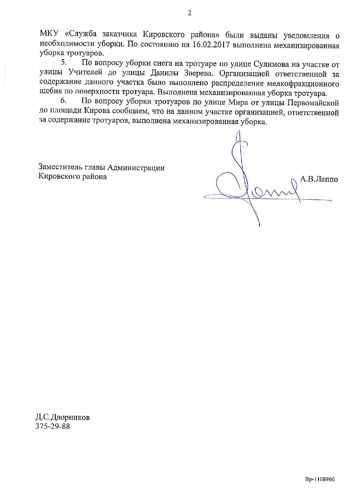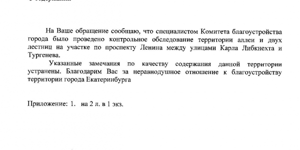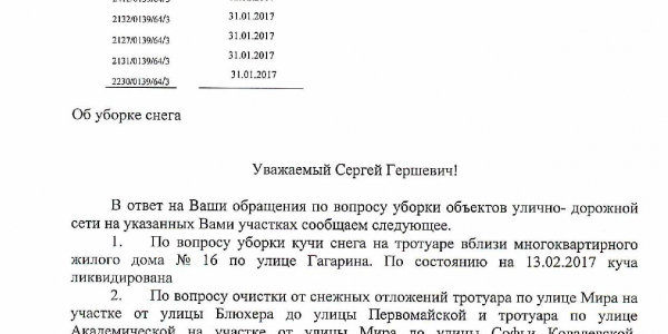 Номер жалобы:14005 Тип жалобы:Качество уборки снега на тротуарах Название объекта:Администрация Екатеринбурга Регион:Свердловская область Город:Екатеринбург Адрес:улица Мира Описание жалобы:Неудовлетворительно производится уборка снега на тротуарах вдоль нечётной стороны улицы Мира на участке от улицы Блюхера до улицы Первомайской, на обеих сторонах улицы Академической на участке от улицы Мира до улицы Софьи Ковалевской и на аллее вдоль улицы Мира на участке от улицы Блюхера до улицы Академической. Уборка перечисленных тротуаров произведена не до покрытия, на тротуарах присутствует уплотнённый снег и гололёд. Статус: