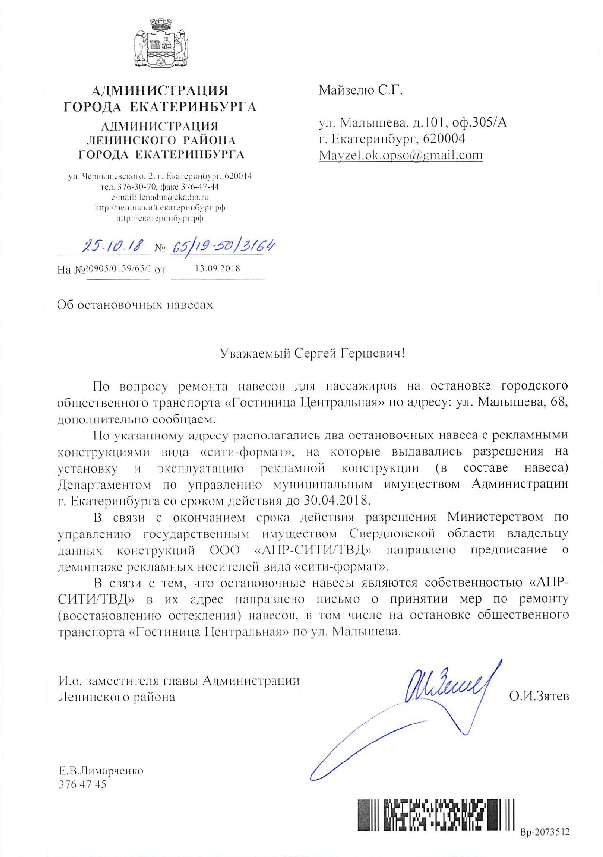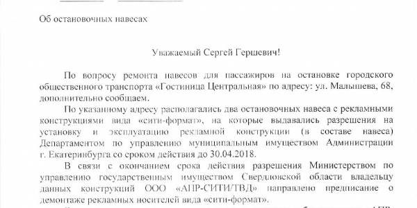 Номер жалобы:41391 Тип жалобы:Ненадлежащее содержание малых архитектурных форм Название объекта:Мэрия Регион:Свердловская область Город:Екатеринбург Адрес:улица Малышева, 68 Описание жалобы:Отсутствует несколько стёкол на задних стенках навесов на остановке «Центральная гостиница» в направлении улицы Луначарского. Статус:
