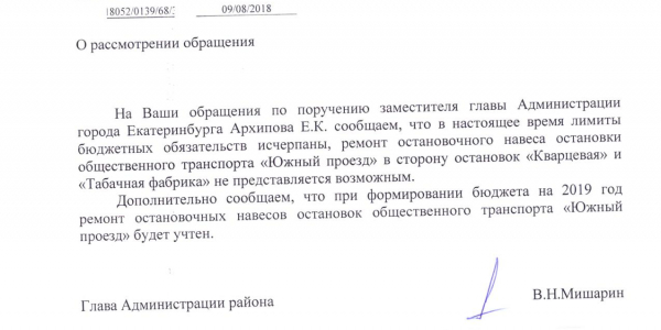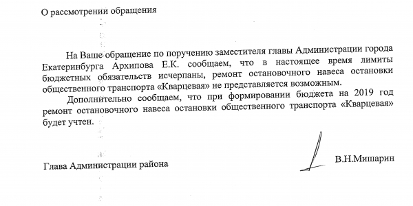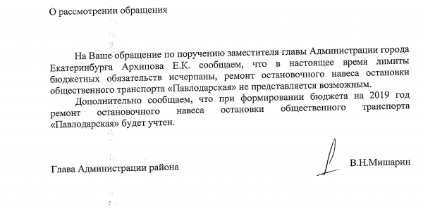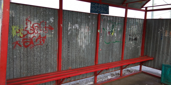 Номер жалобы:39526 Тип жалобы:Ненадлежащее содержание малых архитектурных форм Название объекта:Администрация Екатеринбурга Регион:Свердловская область Город:Екатеринбург Адрес:Самолётная улица, 102 Описание жалобы:На навесе на остановке «Кварцевая» в сторону остановки «Южный проезд» отсутствуют боковые стенки. Статус: