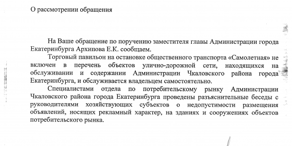 Номер жалобы:39498 Тип жалобы:Ненадлежащее содержание малых архитектурных форм Название объекта:Администрация Екатеринбурга Регион:Свердловская область Город:Екатеринбург Адрес:Самолётная улица, 4 Описание жалобы:Навес на остановке «Самолётная» в направлении остановки «Межевая» обклеен остатками объявлений, внутри на стенах нанесены граффити. Статус: