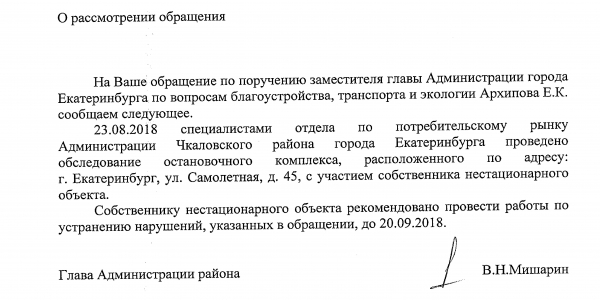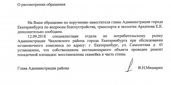 Номер жалобы:39528 Тип жалобы:Ненадлежащее содержание малых архитектурных форм Название объекта:Администрация Екатеринбурга Регион:Свердловская область Город:Екатеринбург Адрес:Самолётная улица, 110 Описание жалобы:Внутри навеса на остановке «Южный проезд» в сторону остановки «Табачная фабрика» нанесены надписи, оставлена доска от рекламного стенда, облезла краска с потолка. Разрушена плита основания навеса. Статус: