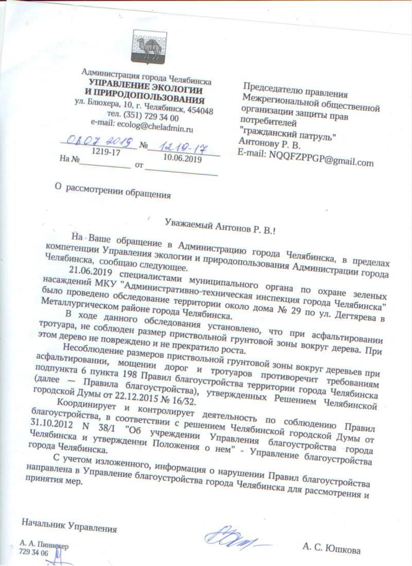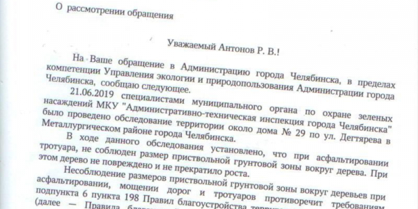 Номер жалобы:55989 Тип жалобы:Иные проблемы ЖКХ Название объекта: Регион:Челябинская область Город:Челябинск Адрес:улица Дегтярёва, 29 Описание жалобы:У дома Дегтярева 29, во дворе, был построен узенький тротуар и строители закатали дерево в асфальт. Через год оно умрёт. Примите меры. Совет, в Европе и даже в развитых российских городах вокруг деревьев укладывается приствольная решетка, через которую дерево питается водой. Статус:
