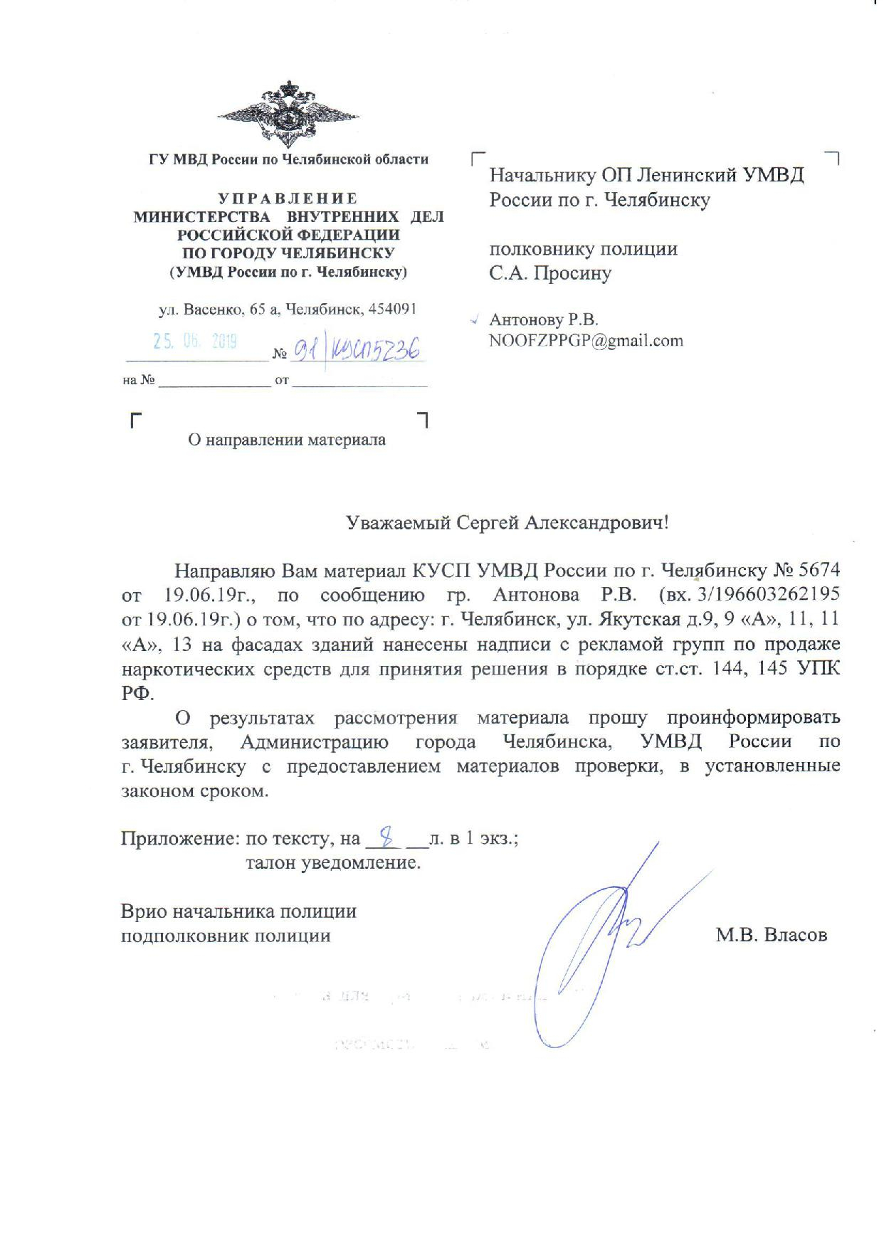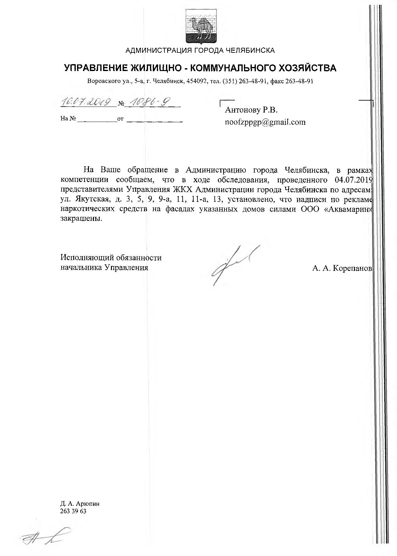 Номер жалобы:56103 Тип жалобы:Иные проблемы ЖКХ Название объекта: Регион:Челябинская область Город:Челябинск Адрес:жилой комплекс Квартал на Дзержинского Описание жалобы:1086-9 По адресам: Якутская 9, 9а, 11, 11а, 13. На фасадах домов нанесены надписи с ссылками на ресурсы по продаже наркотических средств. Статус: