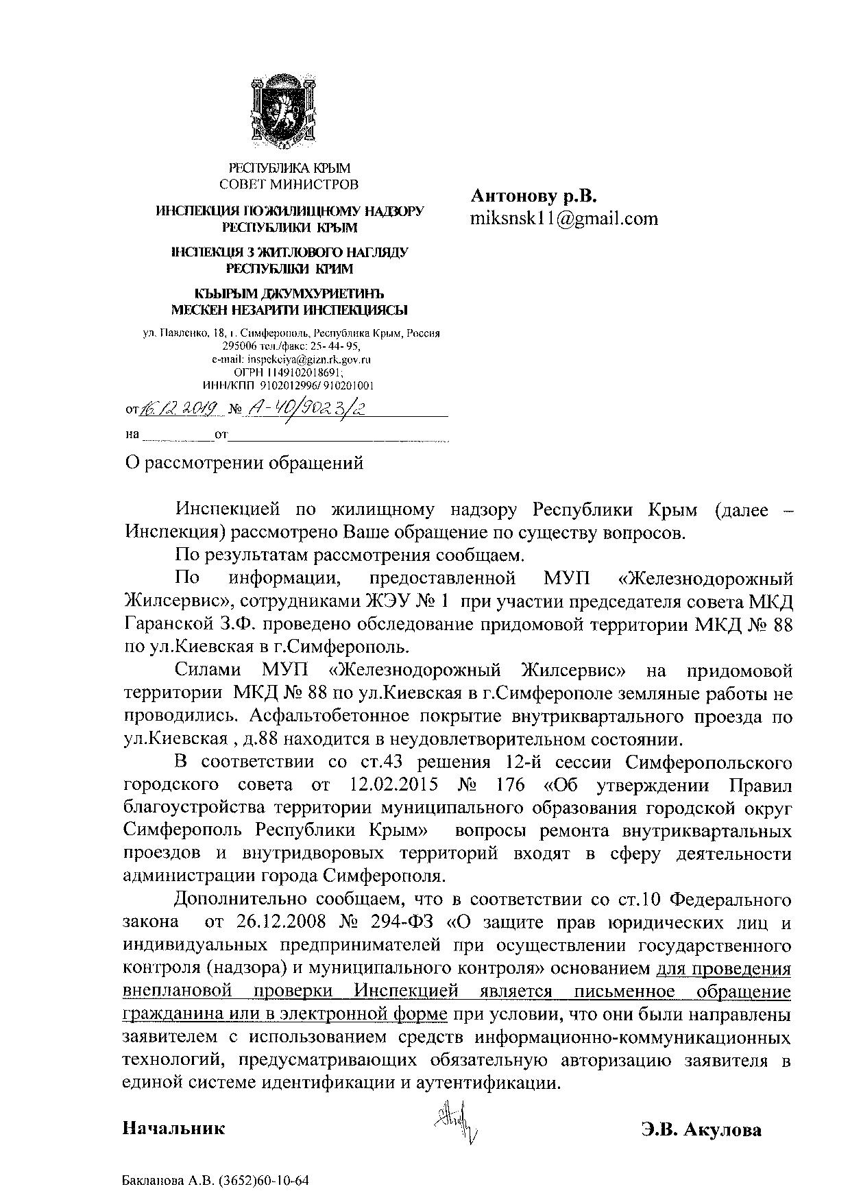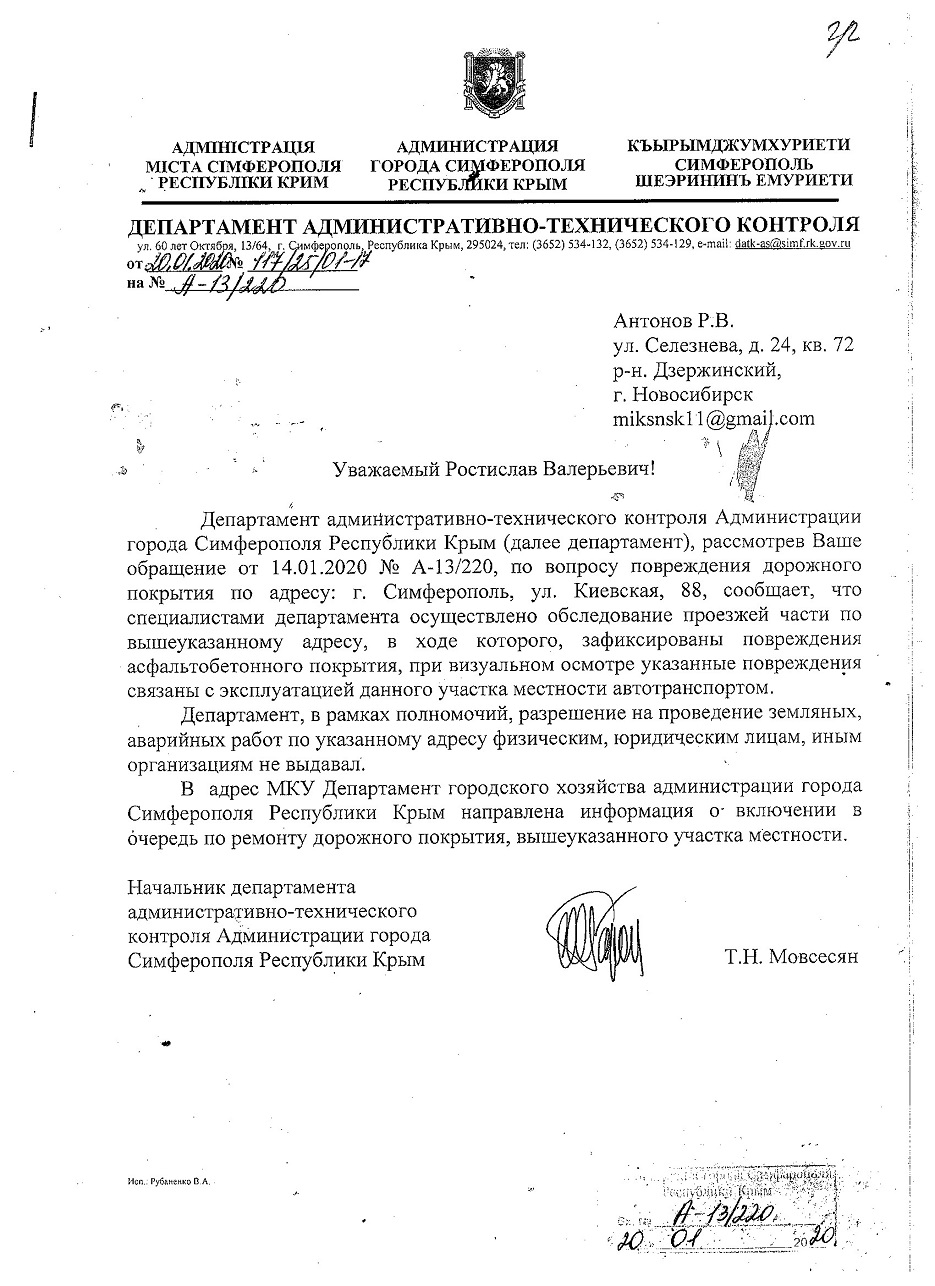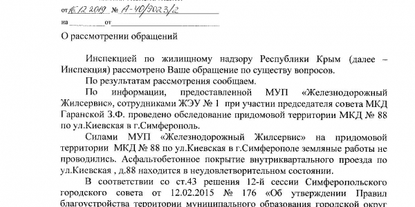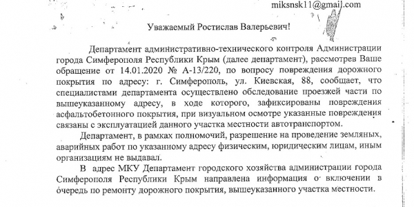 Номер жалобы:61873 Тип жалобы:Прочее Название объекта:Администрация Симферополя Регион:Республика Крым Город:Симферополь Адрес:Киевская улица, 88 Описание жалобы:После раскопок во дворе дома не восстановлено асфальтовое покрытие, а также разрушены бордюры, прошу восстановить за счет организации проводившей раскопки, в соответствии правил благоустройства Симферополя Статус: