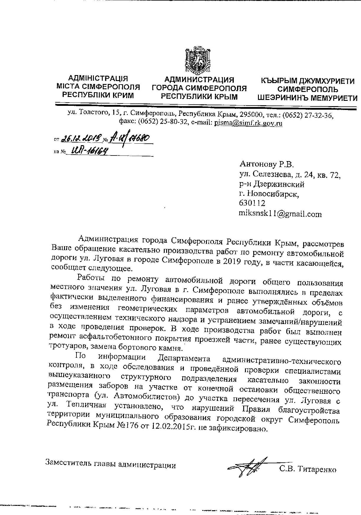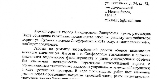 Прошу вынести представление заказчику работ МКУ «Департамент капитального строительства Администрации города Симферополя Республики Крым» тел. 8(3652)27-64-00 по причине не соответствия проекта капитального ремонта МКР Луговое требованиям действующих регламентов, Сводов Правил, Федеральным Законам, подрядчик ООО «ДОРИНВЕСТ-КРЫМ». Прошу исправить следующие нарушения По ул. Луговой от дома 107 до дома 44: