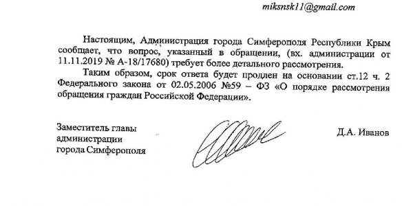 Номер жалобы:61892 Тип жалобы:Прочее Название объекта:МКУ «Департамент капитального строительства Администрации города Симферополя Республики Крым» тел. 8(3652)27-64-00 Регион:Республика Крым Город:Симферополь Адрес:Луговая улица Описание жалобы:В прокуратуру 59053, фото отправил на почту