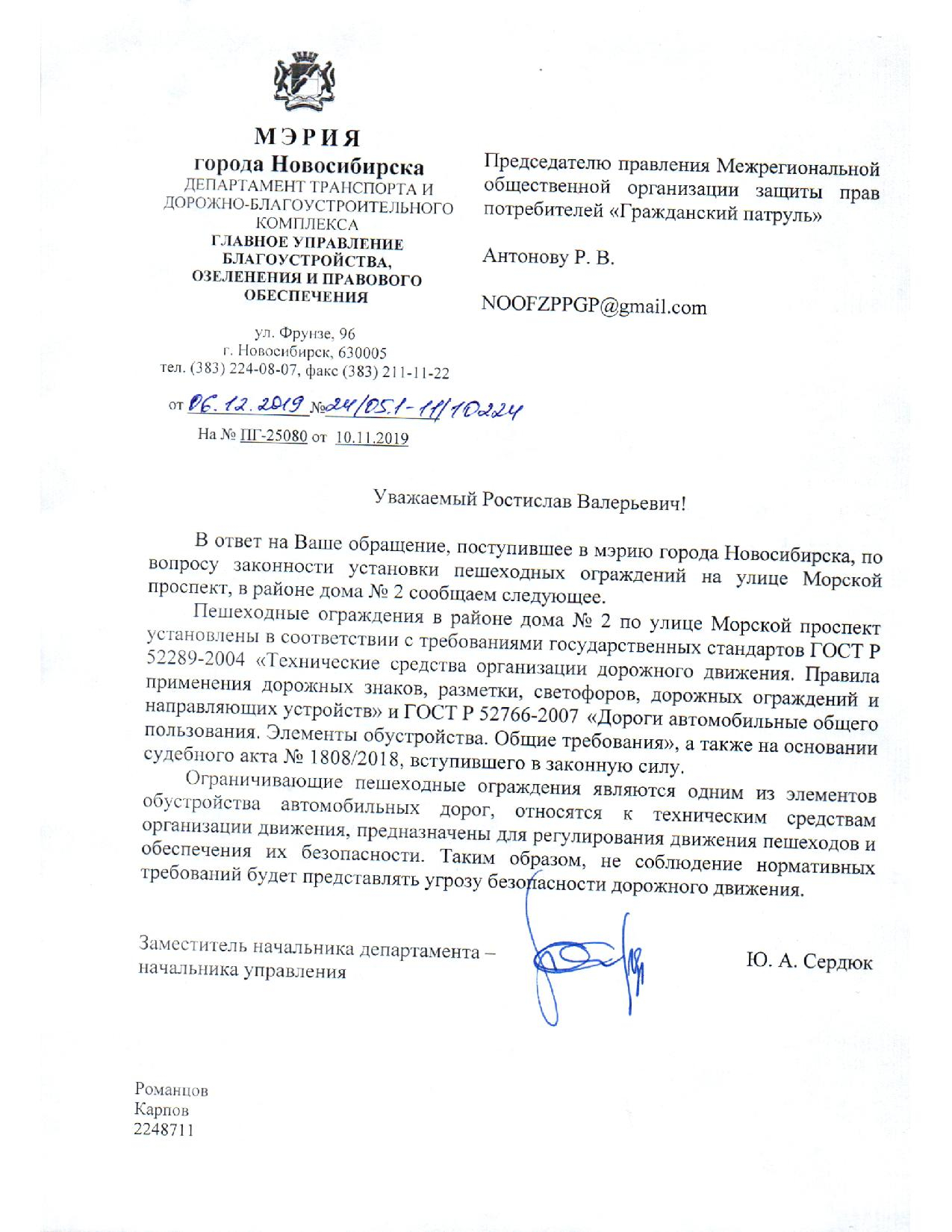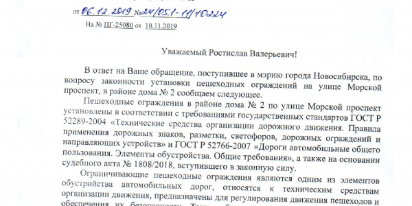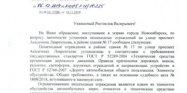 Номер жалобы:61827 Тип жалобы:Прочее Название объекта: Регион:Новосибирская область Город:Новосибирск Адрес:проспект Академика Лаврентьева, 17 Описание жалобы:Новое дорожное ограждение на перекрёстке блокирует велодорожку Статус: