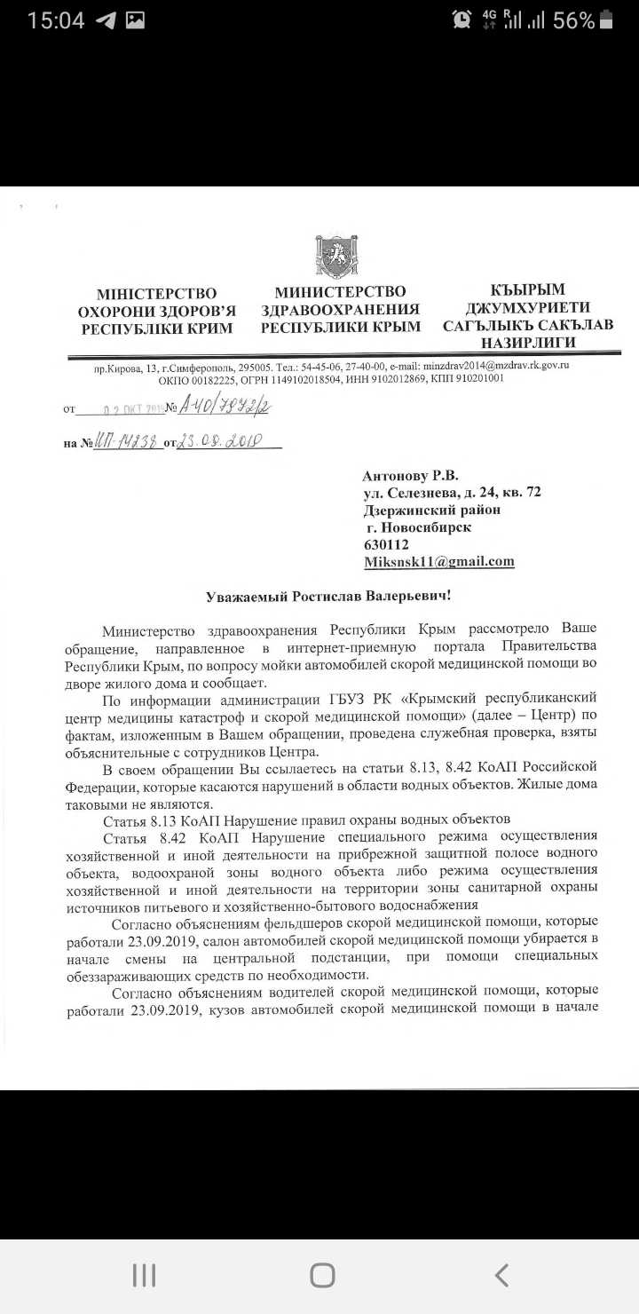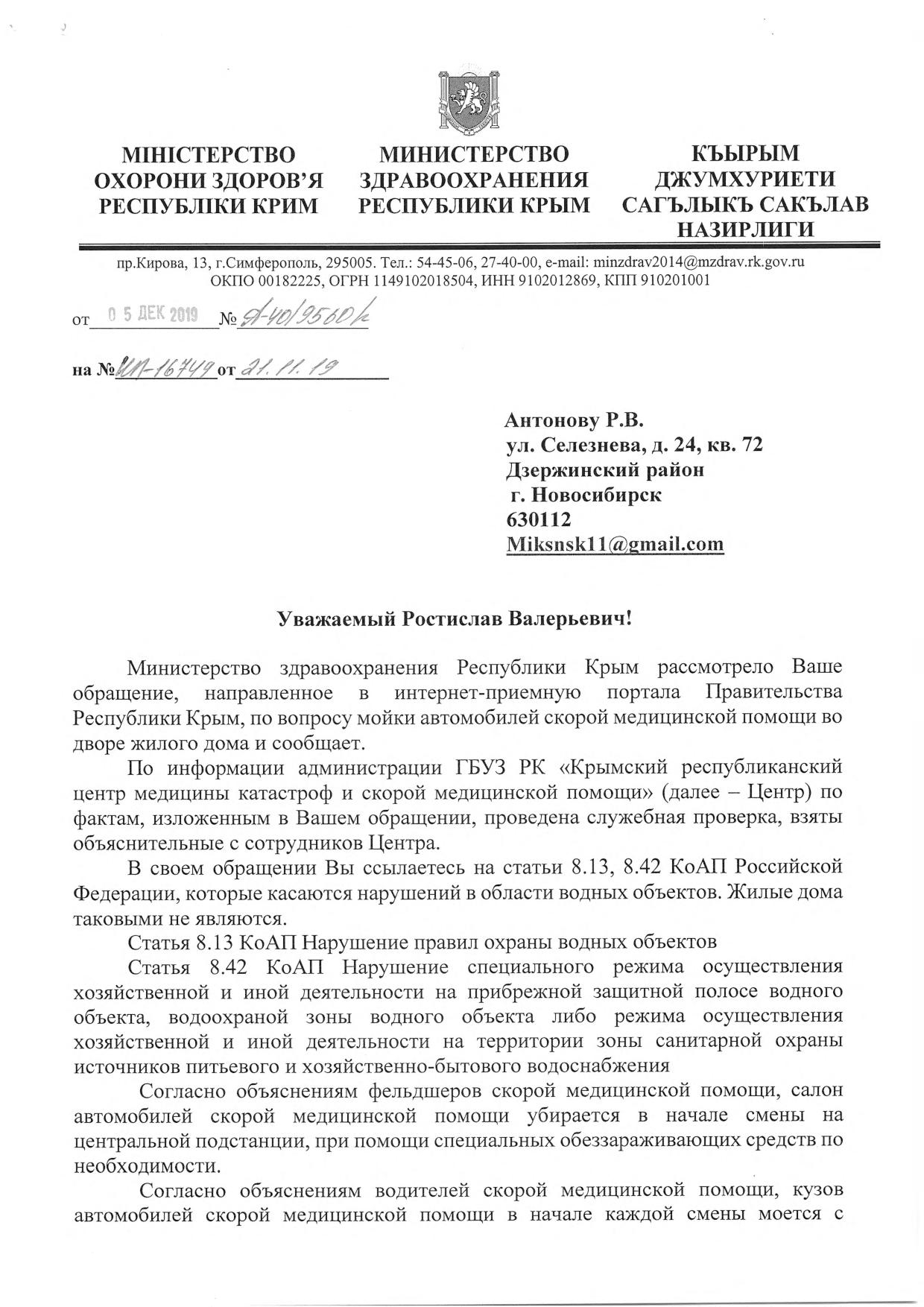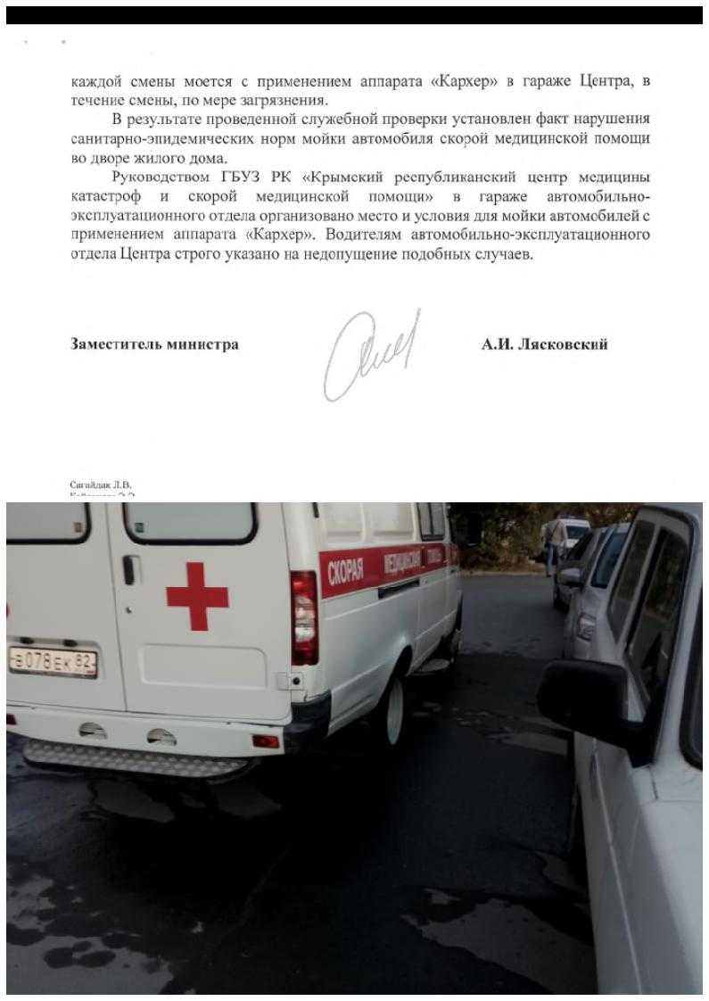 Номер жалобы:61845 Тип жалобы:Прочее Название объекта: Регион:Республика Крым Город:Симферополь Адрес:Балаклавская улица, 81 Описание жалобы:Повторно, после проведения проверки мин. здравоохранения Крым, и фиксации факта помывки автомобилей скорой помощи, ничего не изменилось,водители также моют машины, тратят положенное время отдыха на мытье, нарушают нормы САНПина.