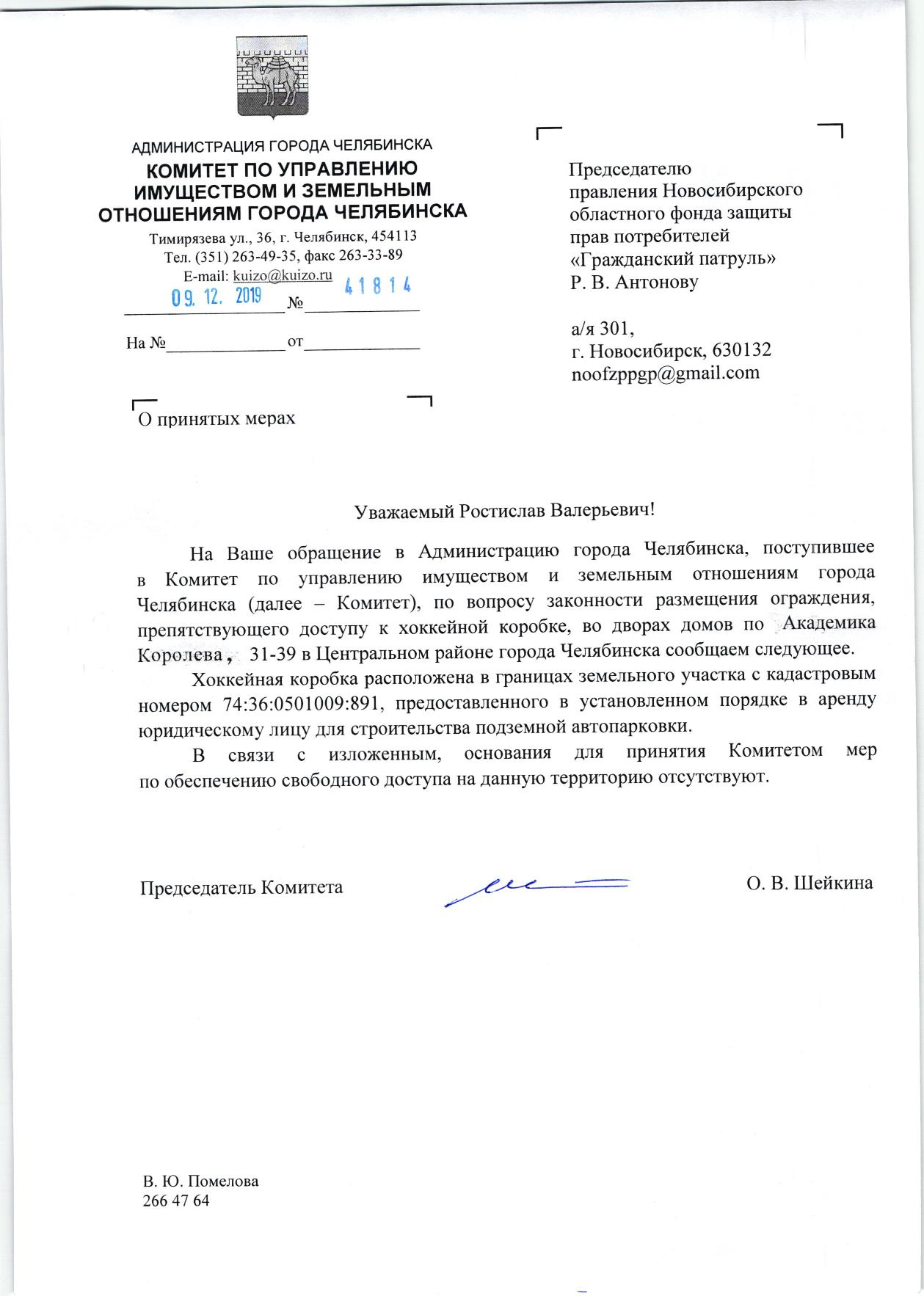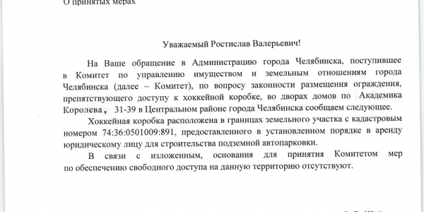 Номер жалобы:61851 Тип жалобы:Прочее Название объекта: Регион:Челябинская область Город:Челябинск Адрес:улица Академика Королёва, 31 Описание жалобы:Ограждение, установленное у домов по адресу АК.Королева 31,33,35,36,39 мешают проходу к хоккейной коробке, которая была установлена для всего микрорайона, но стала "захваченной" этими домами. Статус: