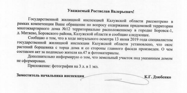 Наро-Фоминск-11/ Боровск-1/ военный городок № 14/ военный городок № 2538Д (Митяево), ближайшего к гаражам и за самим домом вырос борщевик. Жители дома обеспокоены плантациями опасного растения, так как исходя из опыта предыдущих лет борщевик вырастает выше человеческого роста, своими листьями залазит в окна квартир, расположенных на 1-ом этаже и может причинить тяжкий вред здоровью людей. Управляющая компания ООО «ГУЖФ» соответствующих и своевременных мер к его покосу не предпринимает. Военным борщевик параллелен!