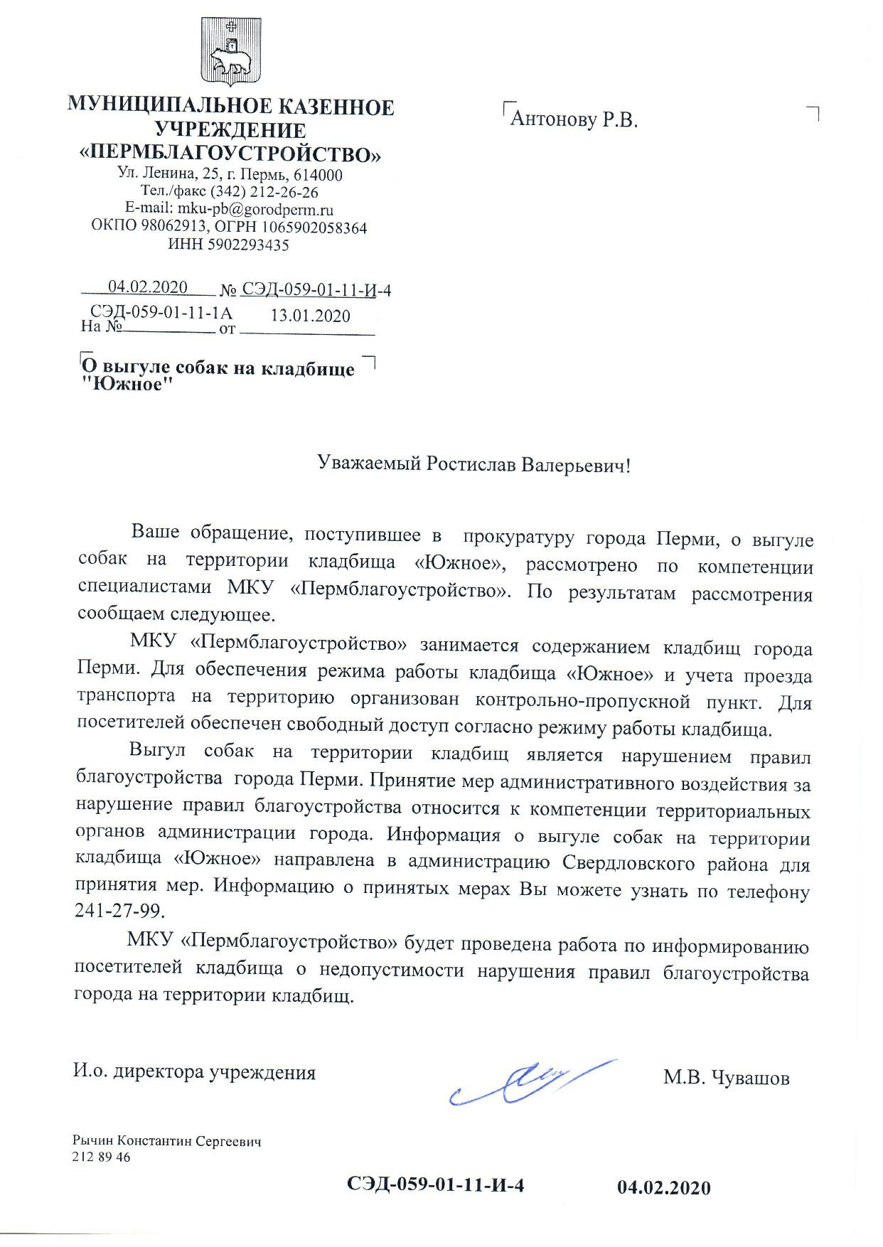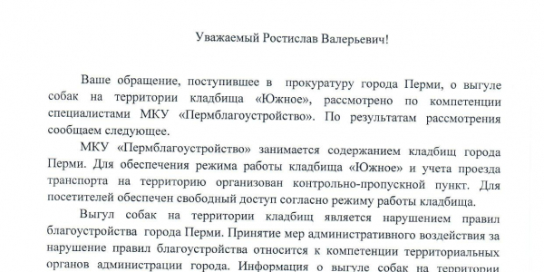 Номер жалобы:61745 Тип жалобы:Прочее Название объекта: Регион:Пермский край Город:Пермь Адрес:Южное кладбище Описание жалобы:Владелец частного приюта - «ОГРН