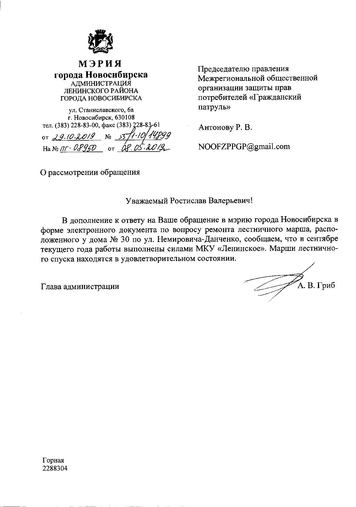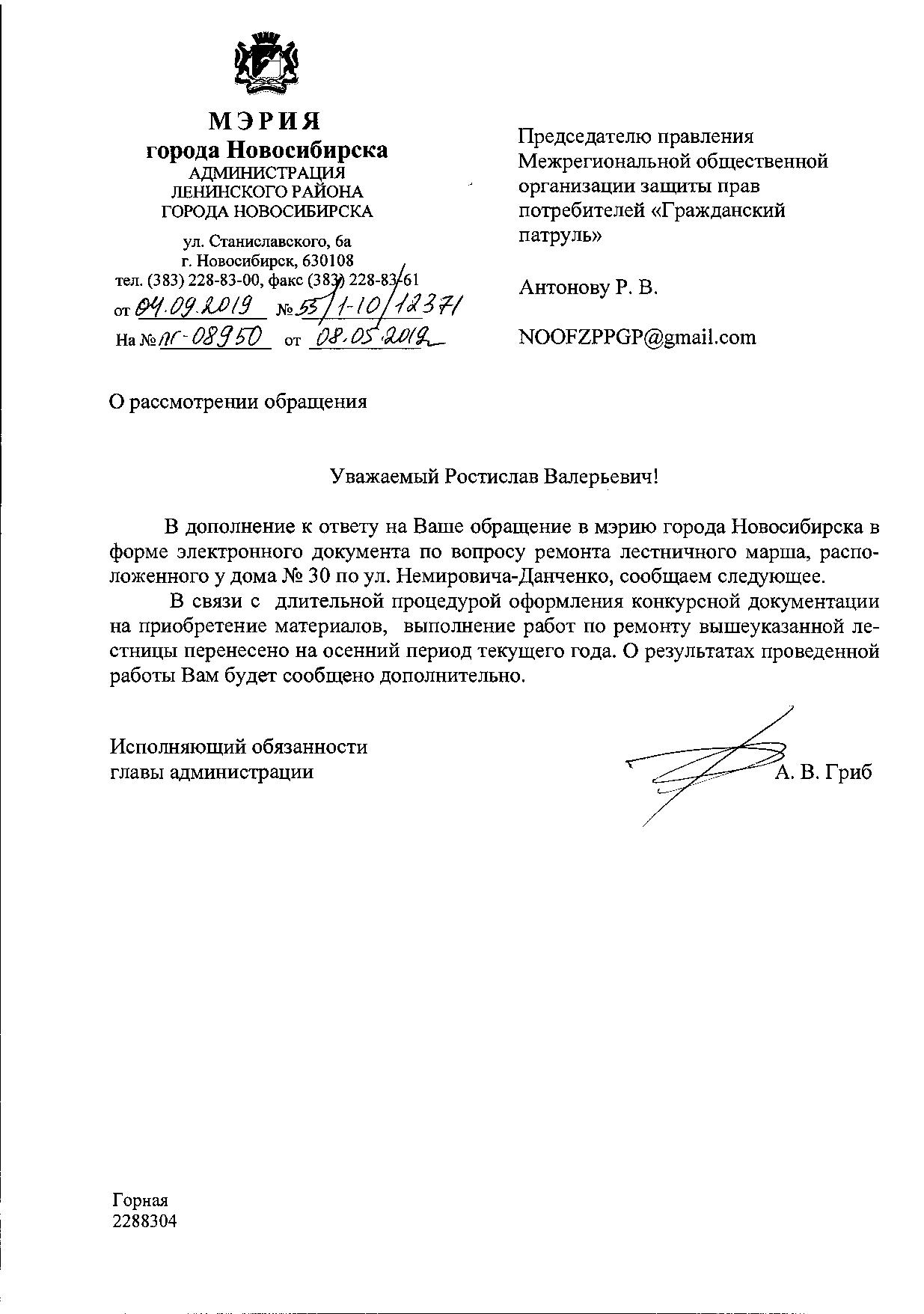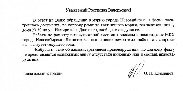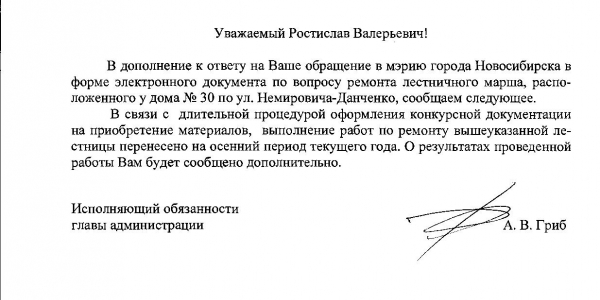 Номер жалобы:54396 Тип жалобы:Иные проблемы ЖКХ Название объекта: Регион:Новосибирская область Город:Новосибирск Адрес:улица Немировича-Данченко, 30 Описание жалобы:Разваливается гранитная лестница ведущая от светофора вниз на массив Статус: