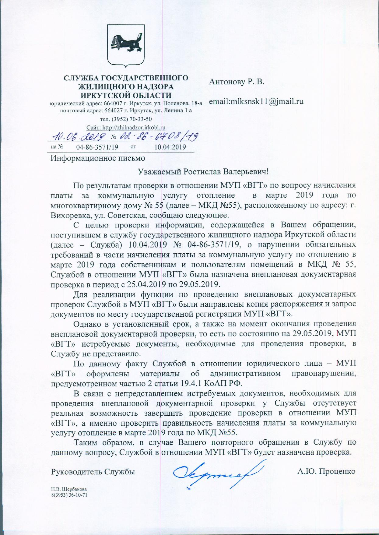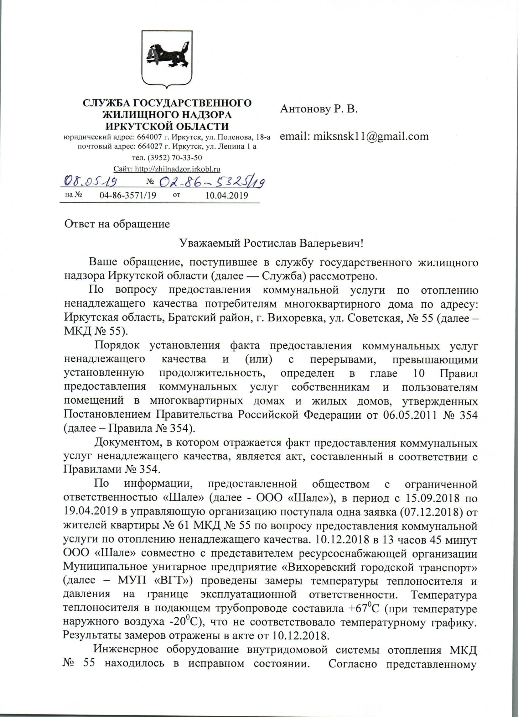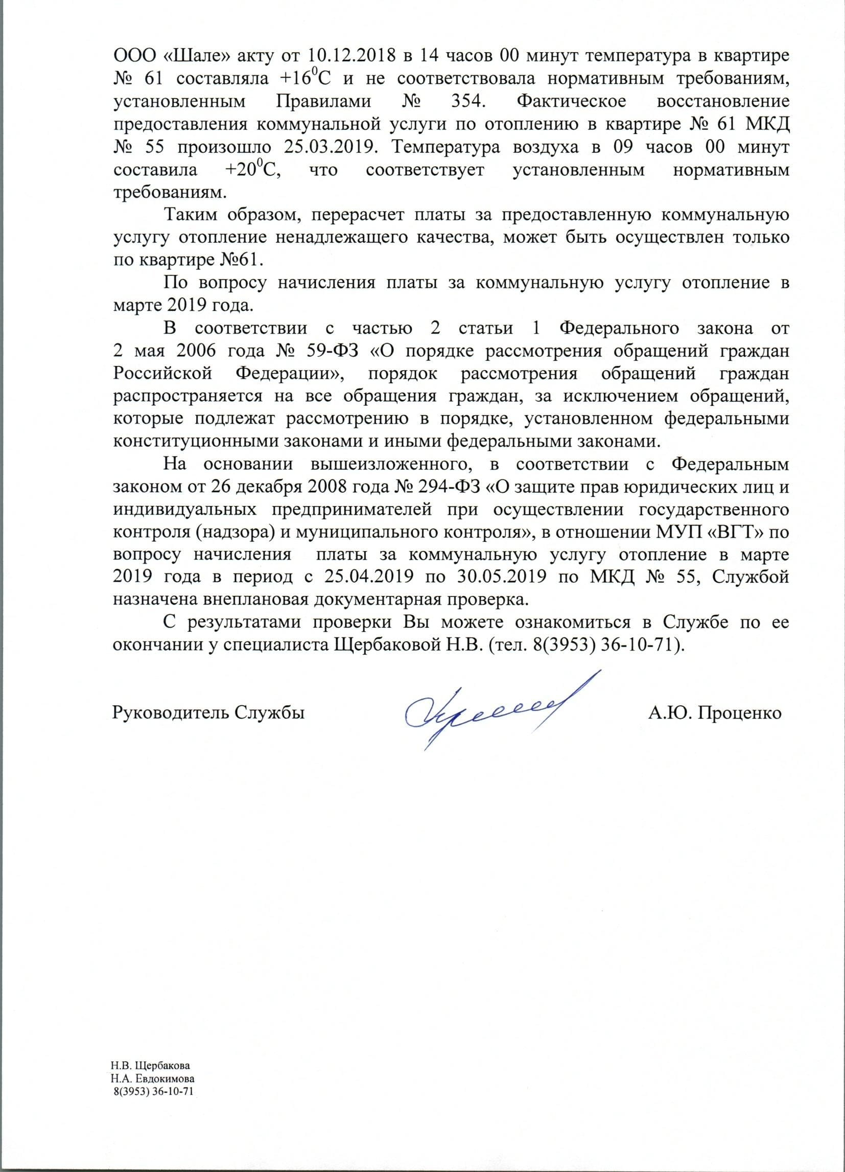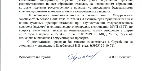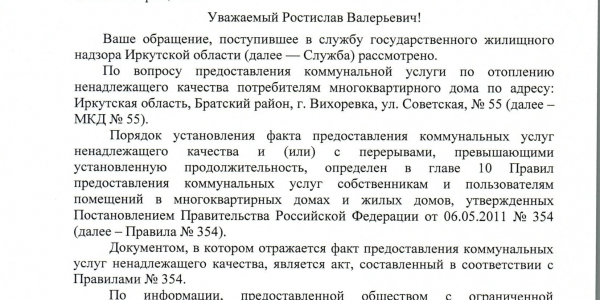Номер жалобы:53021 Тип жалобы:Иные проблемы ЖКХ Название объекта:МУП ВГТ Регион:Иркутская область Город:Вихоревка Адрес:Советская 55-21 Описание жалобы:Поступил перерасчет ком услуг на 2224 руб (за тепло ) которого небыло по факту (мерзли даже по телевизору показывали) и постоянно отключали и так не горяячии ботареи Статус: