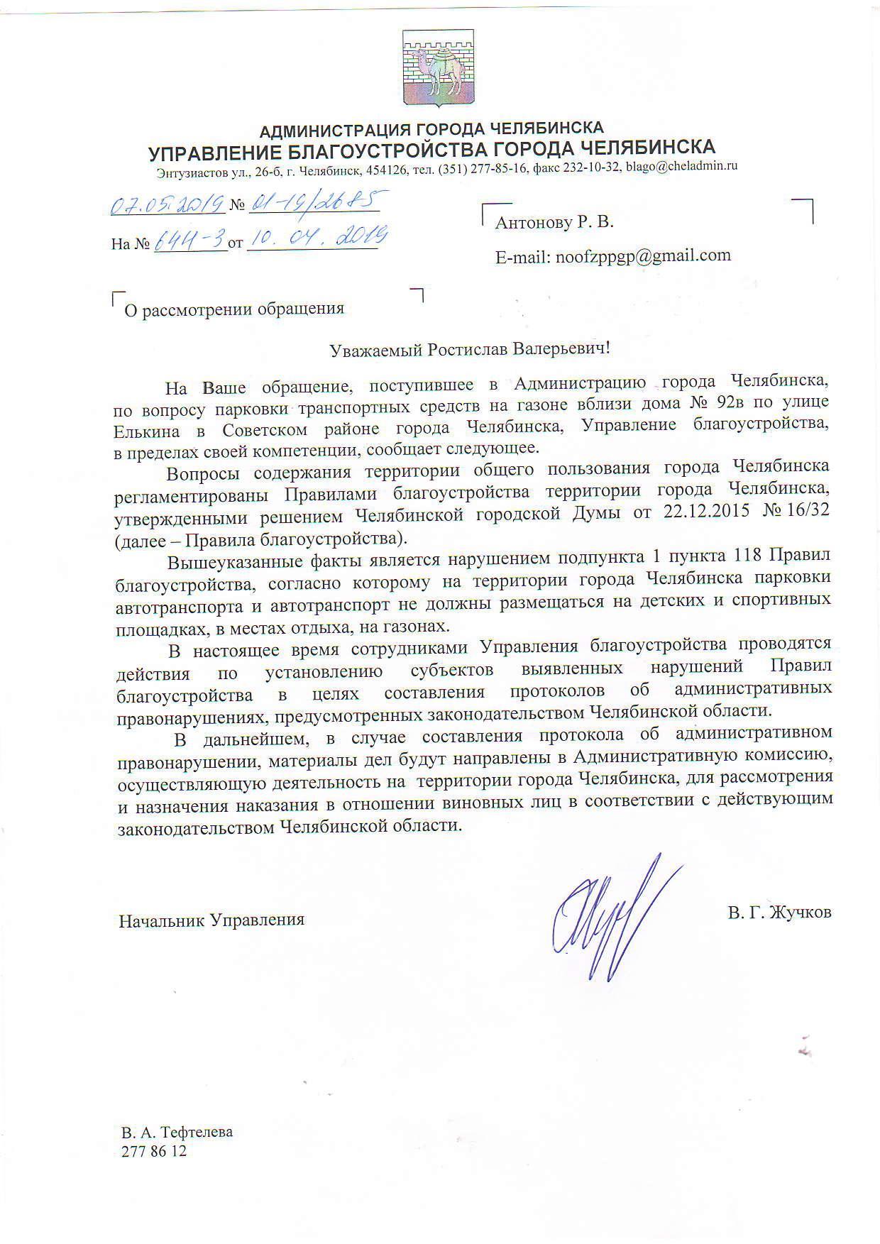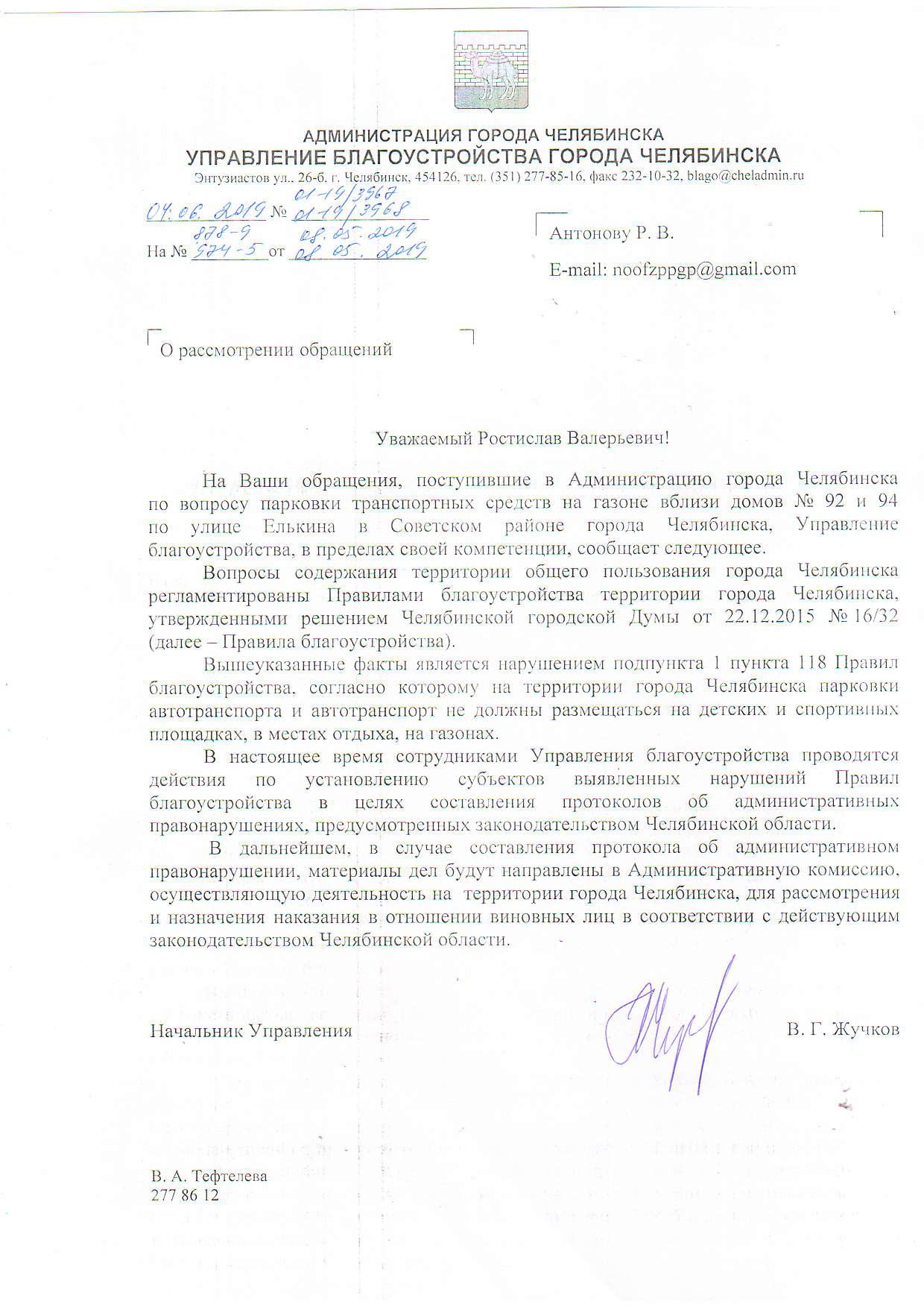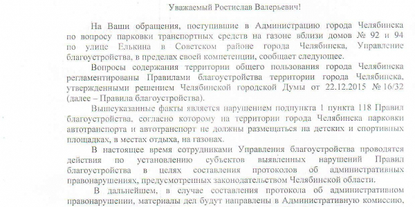 Номер жалобы:53051 Тип жалобы:Иные проблемы ЖКХ Название объекта: Регион:Челябинская область Город:Челябинск Адрес:улица Елькина, 92В Описание жалобы:Массовая парковка на газоне. Статус:
